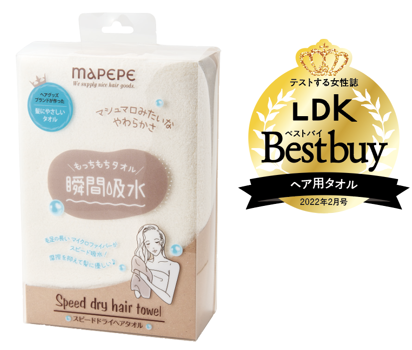 髪はドライヤーの熱ダメージで傷むので、しっかりタオルドライすることが重要。頭皮にやさしく吸水性の高いマペペのヘア用タオルを使うことで、熱ダメージを最小限に抑えられます。長さも85cmで頭に巻きやすいのも◎。