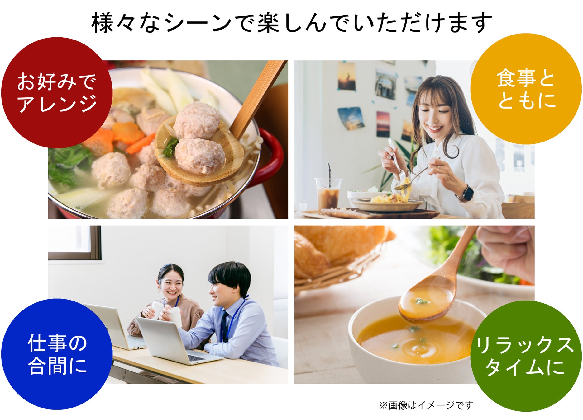 水分を含むと膨らむ性質をもつ食物繊維たっぷりの素材「オオバコ(サイリウム/プランタゴ・オバタ)種皮末」を配合。和風顆粒をお湯でサッと混ぜるだけで、とろみのある和風スープが完成します。