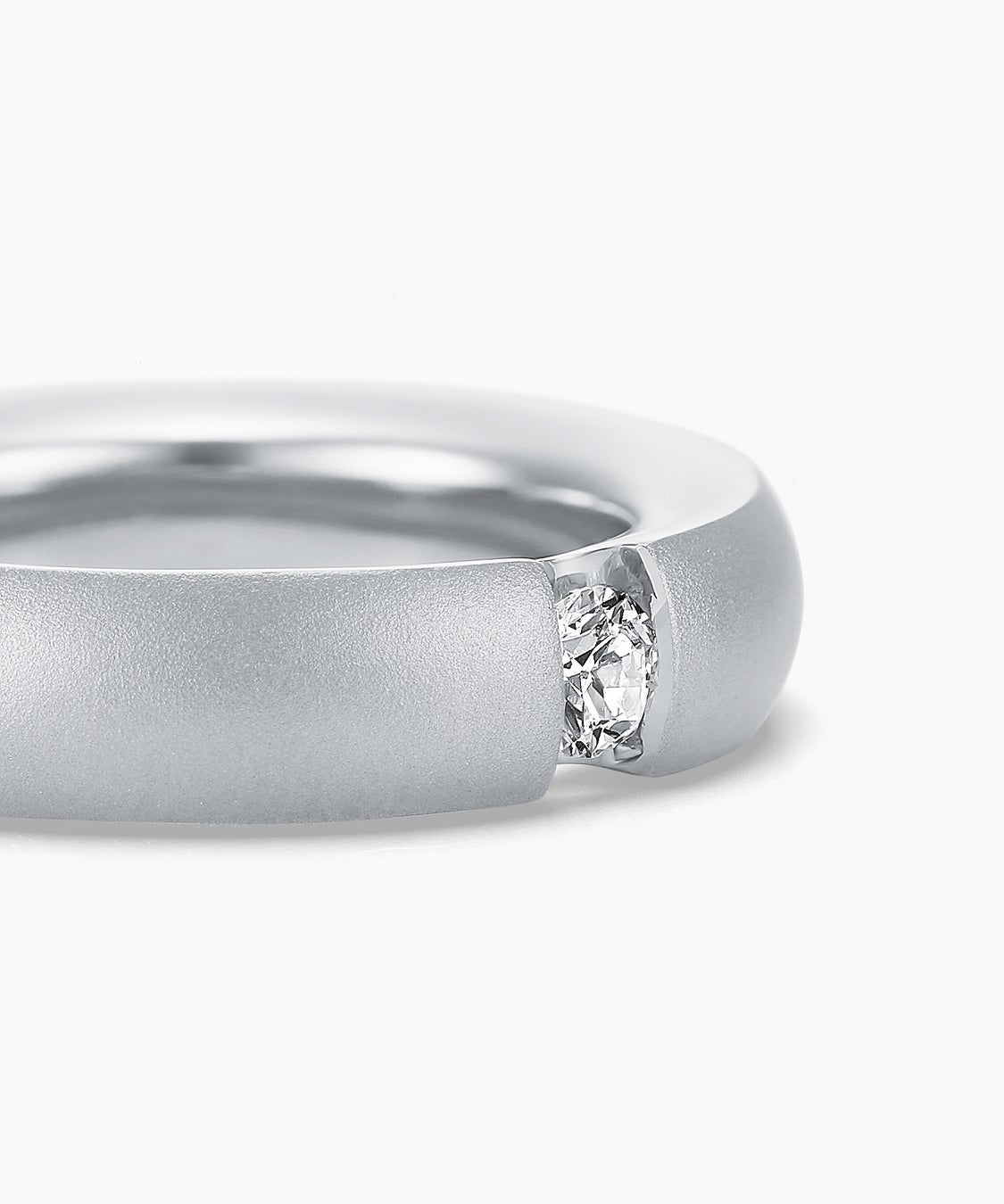 石留めは、ダイヤモンドをぐっと大きく鮮やかに見せる伏せ込みで仕上げています。中石と地金の一体感を出すとともに、石座の存在を感じさせずダイヤモンドそのものを堪能できる設計です。