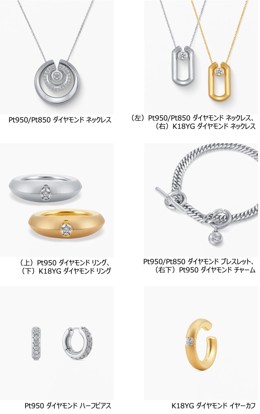 デビューコレクションを飾るのは、ネックレスやチャーム、ロングネックレス、リング、ピアス、イヤーカフス、ブレスレット、バングルの計8アイテム。格調高いパッケージには再生紙を使用し、ユニークなデザインのショッパーは生地工場の残布を再利用するなど、ディテールに至るまでブランドが宿すキーワード”Eternally(永遠)”、”Borderless(境界のない)”、”Noble(気高い)”が息づいています。