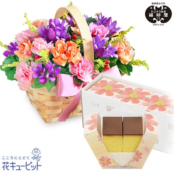 ピンクのリボンを添えた可愛らしい【リンドウのウッドバスケット】と、1624年創業の「福砂屋」が、手づくりの古法で丹精こめて焼き上げるカステラとのセットです。手立ての泡のよさから生まれるしっとりとした美味しさ、底に残るザラメ糖のシャリッとした感触、熟成させた甘みとコクを味わっていただけます。