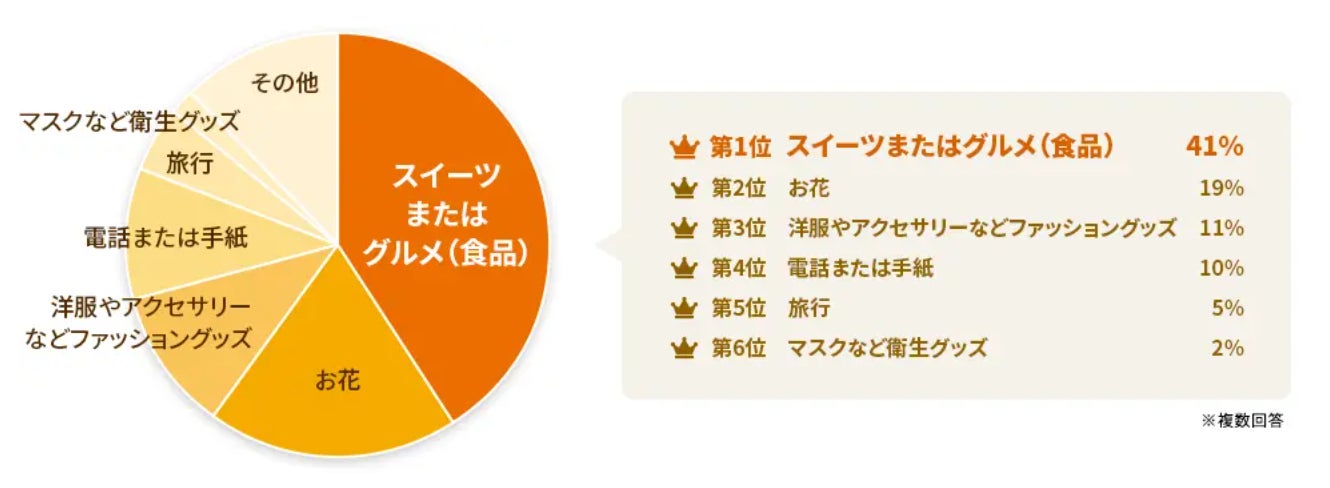 敬老の日に今までもらって嬉しかったプレゼントは、「スイーツまたはグルメ」、続いて「お花」という結果になりました。洋服やアクセサリーなどの形に残るものよりも「消えもの」が上位になっています。