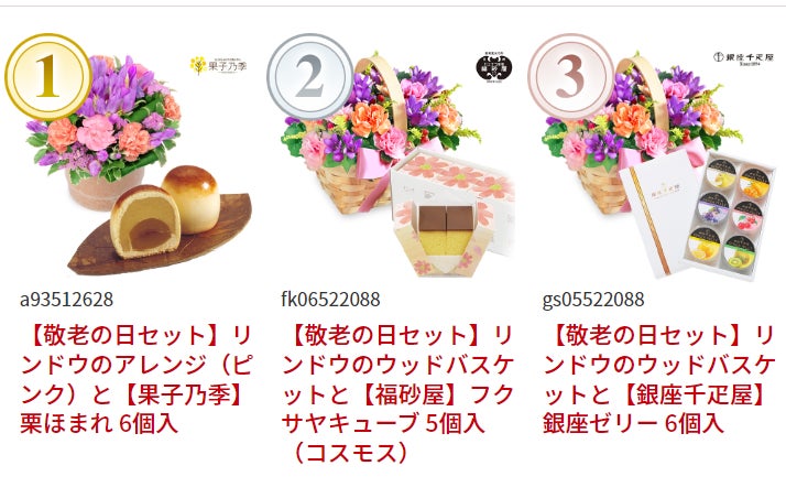 敬老の日の花とスイーツのセットギフト商品ランキングは以下のとおりです。(2023年9月8日時点)