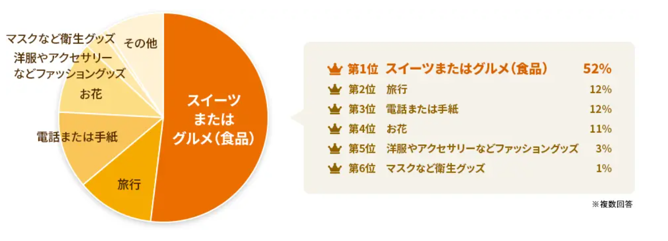 今年、特にもらいたいプレゼントは「スイーツまたはグルメ」が最も多く半数以上となりました。2位以下は「旅行」「電話または手紙」「お花」がほぼ同率で続いています。