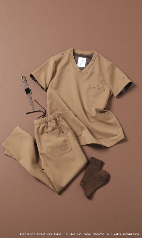 ポケモンたちの姿や名前、図鑑番号などはスクラブのあちこちに刺繍されています。生地や刺繍の色は、それぞれのポケモンをクラシコらしい柔らかなニュアンスカラーで表現。生地の素材はサラサラとした肌触りで、今年はさらにストレッチ性を追加しました。ファッション性を感じるツイル組織で、裏側に静電防止の糸を織り込んだ機能素材です。