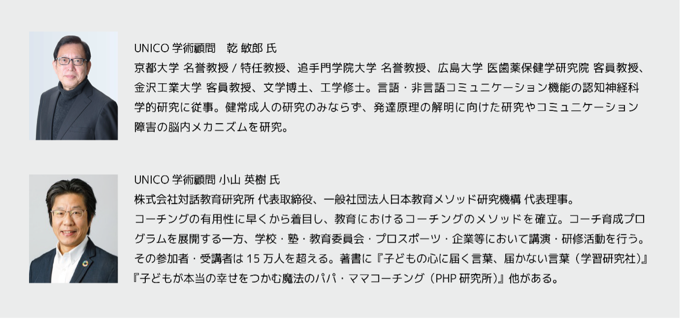 脳科学、発達神経科学、心理学分野における第一人者である京都大学名誉教授、追手門学院大学名誉教授の乾敏郎氏には、発達段階や障害特性に関して脳のメカニズムの観点から監修いただき、さらに、教育コミュニケーション(コーチング、アクティブラーニング)のメソッドを確立し能力開発プログラムを展開してこられた小山英樹氏に、実践的な観点からの監修を頂くことで、学術的に有効な教育・療育コミュニケーションメソッドを完成させました。