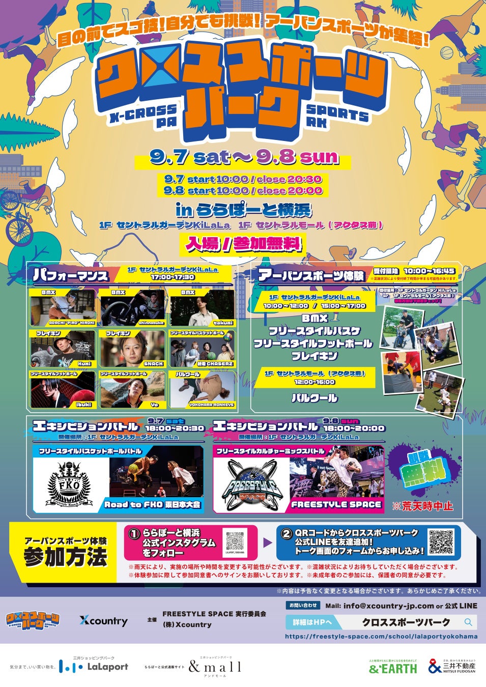 全国各地でアーバンスポーツのイベントを手がける株式会社Xcountry(東京・豊島区)は、「クロススポーツパーク」を9月7日(土)と8日(日)に、神奈川県横浜市の三井ショッピングパーク ららぽーと横浜(以下、ららぽーと横浜)で開催する。参加者はBMX、フリースタイルバスケットボール、フリースタイルフットボール、ブレイキン、パルクールの5種類のアーバンスポーツをプロから直接学ぶことができ、目の前でパフォーマンスも見られる。初日はフリースタイルバスケットボールの大会「Road to FKO 東日本大会」、2日目は様々なアーバンスポーツをミックスさせて競い合う 「FREESTYLE SPACE」が楽しめる。アーバンスポーツの魅力が感じられるイベントとなっている。