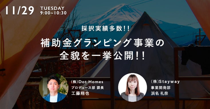 全国累計約100施設のリゾートホテル・グランピング施設など宿泊施設の開業支援、運営受託、コンサルティングを行う株式会社Dot Homes(代表取締役:留田紫雲 以下、Dot Homes)は、補助金・助成金DX事業を行う株式会社Stayway(代表取締役:佐藤淳 以下、Stayway)とグランピング事業開業検討者を対象として『補助金を活用したグランピング事業の全貌を一挙公開!!』と題したウェビナーを共催いたします。