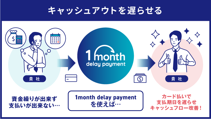 決済機能を利用したBtoB後払いサービスです。このサービスを使って企業が取引先への支払いを行う場合、約30~50日出金を遅らせることができます。