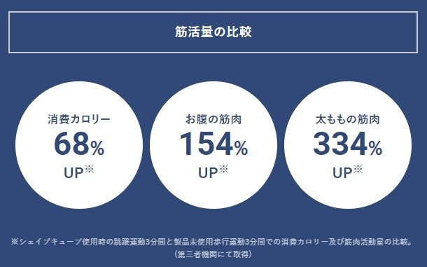 ⇒シェイプキューブを使うと、消費カロリー68%、お腹の筋肉154%、太ももの筋肉334%と筋肉活動量がアップします。(自社調べ)