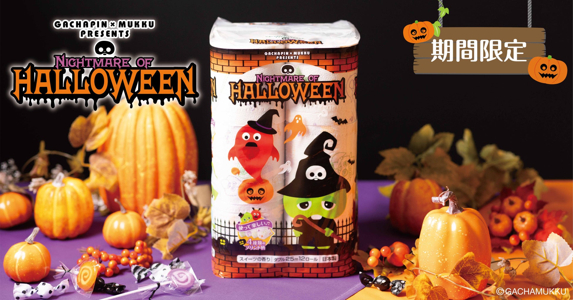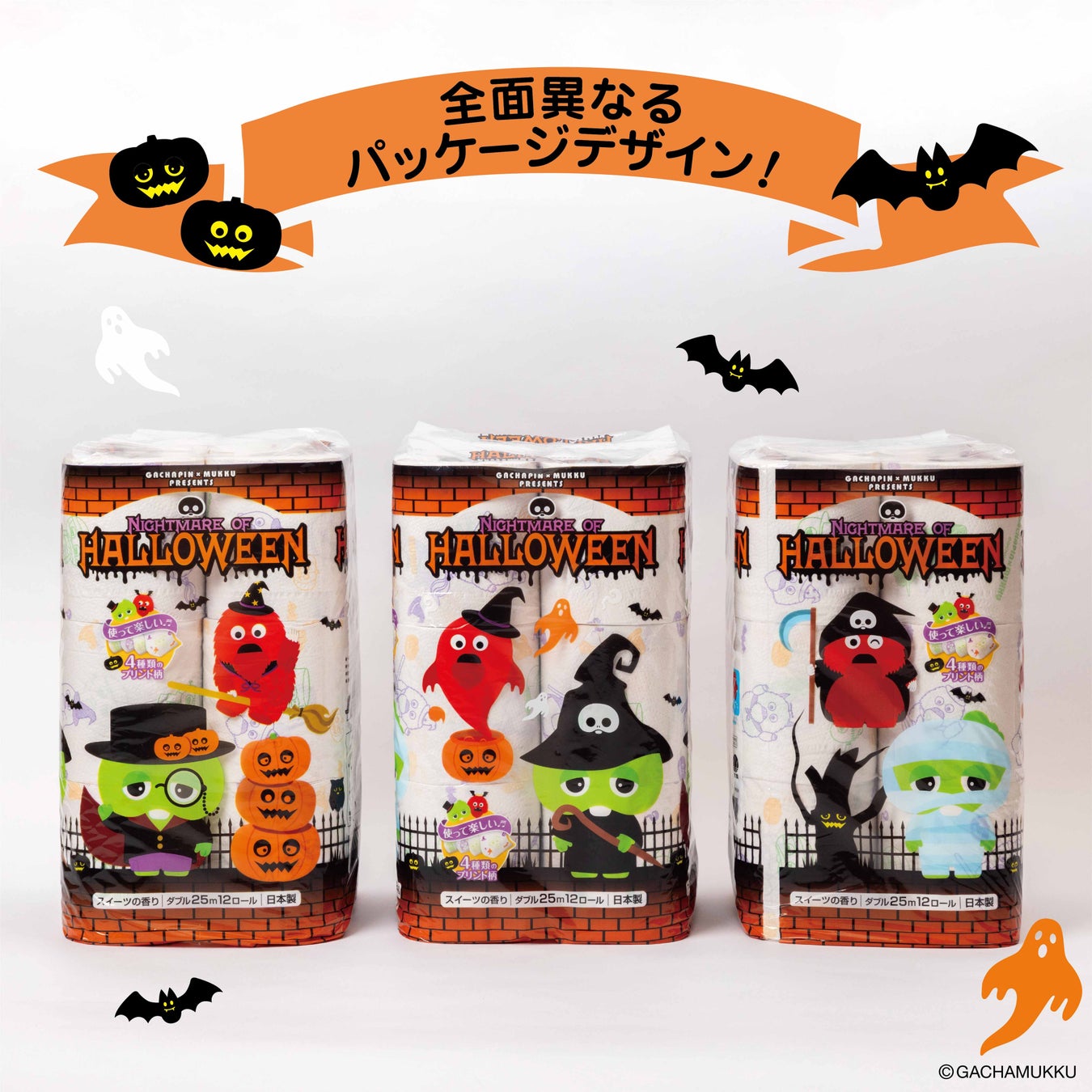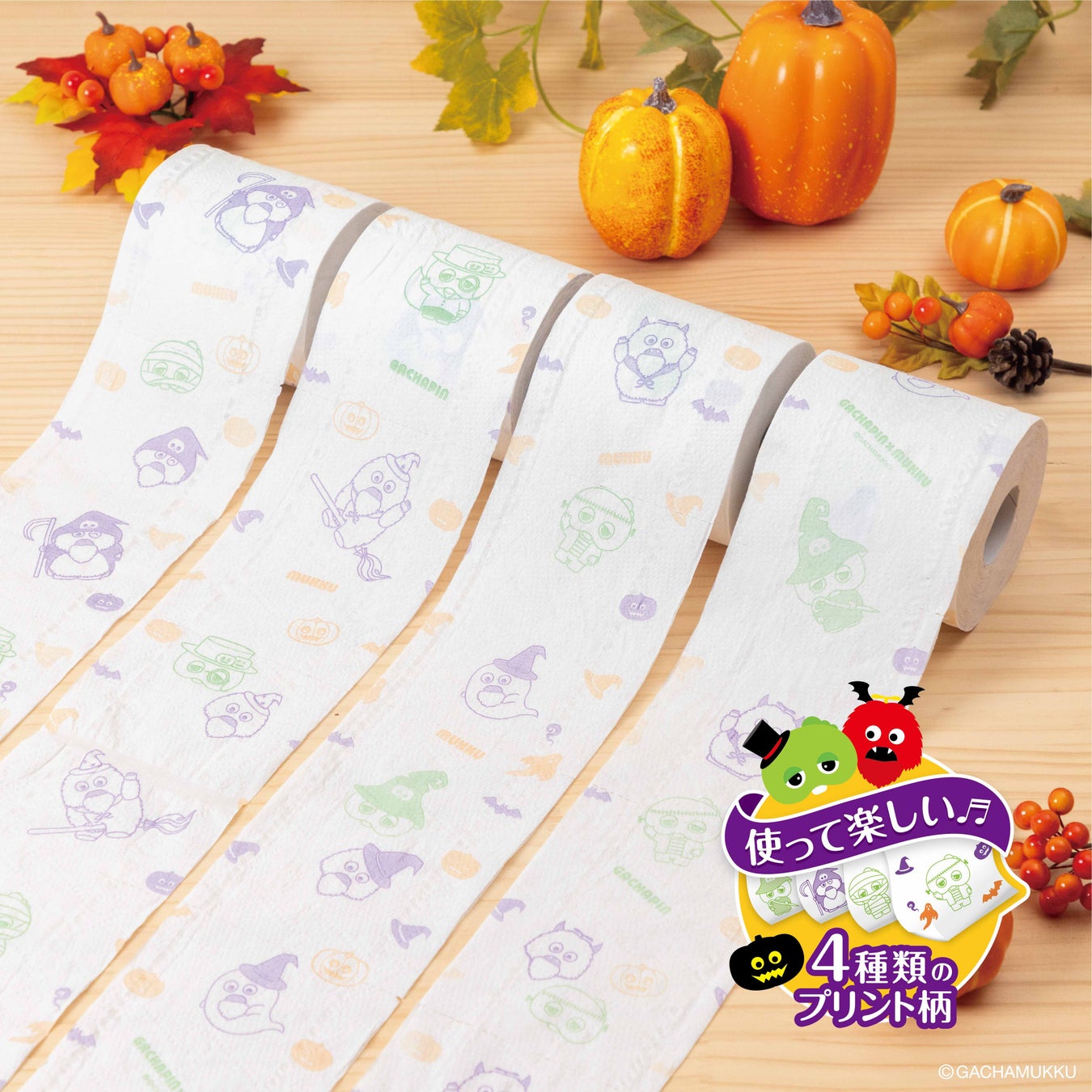発売以来ご好評いただいております、ガチャピン・ムックデザインのシリーズより、ハロウィン仕様のプリントトイレットペーパーをリニューアル発売いたします。
