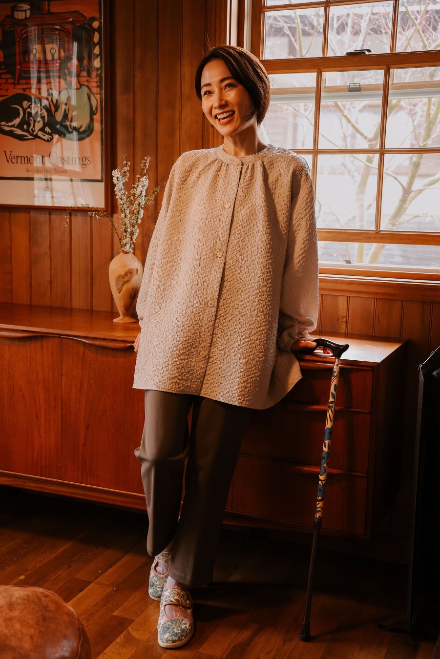 ブラウスとしても羽織りとしても着られる嬉しい一枚です。