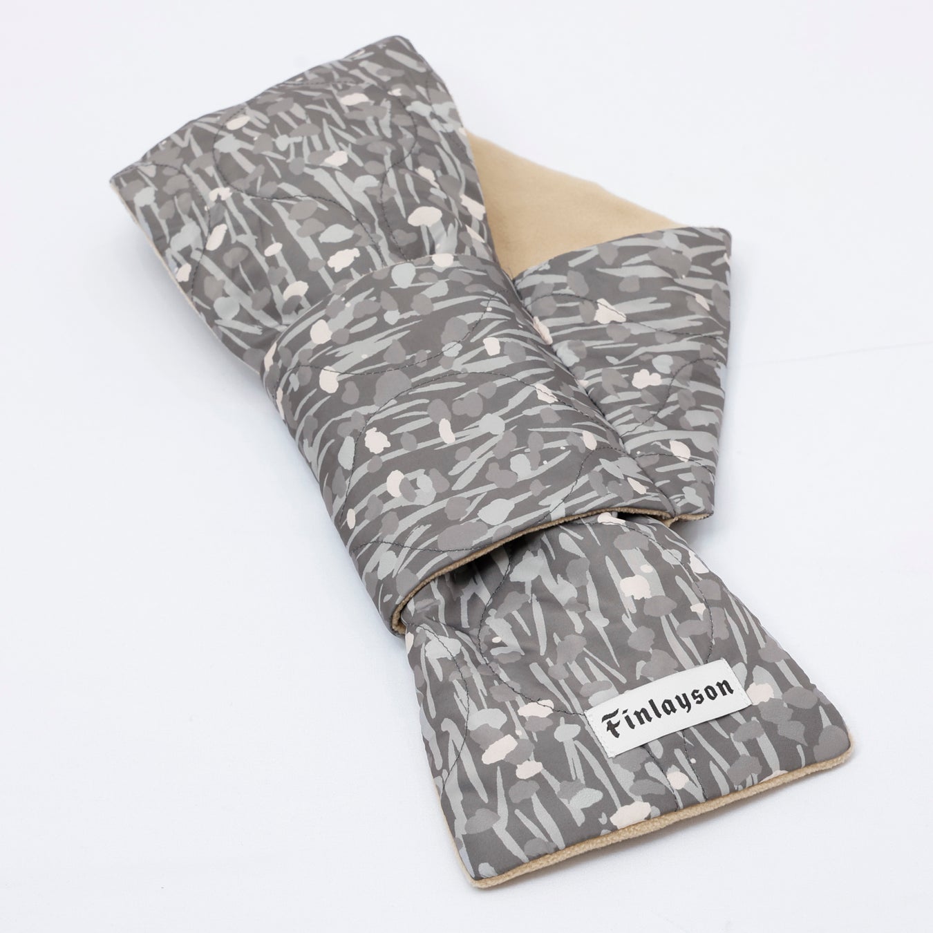 フィンレイソン柄をプリントしたキルティングとフリースのリバーシブル仕様で暖かく、防寒着として着用できます。