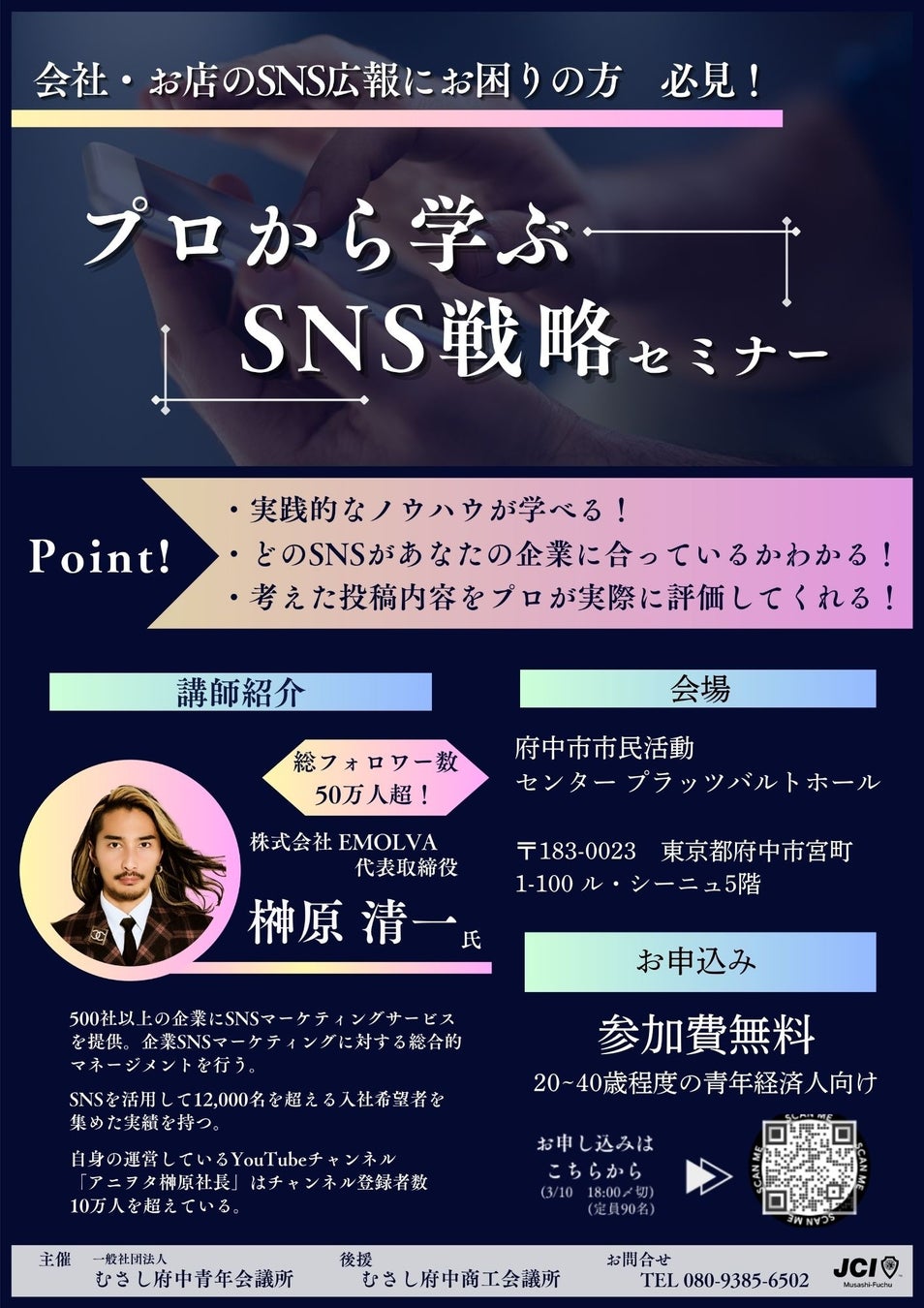 企業SNSマーケティングの総合的なコンサルティング事業を展開する、株式会社EMOLVA(東京都港区、代表取締役:榊󠄀原 清一)が、一般社団法人 むさし府中青年会議所(東京都府中市、理事長:松山 貴行)が主催する「プロから学ぶSNS戦略セミナー」にて、講師として登壇しました。
