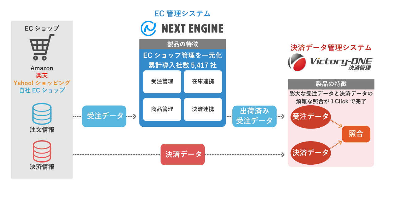 Amazonや楽天市場、Yahoo!ショッピング等のECモール出店ショップや自社で運営するECショップなど、複数ECショップの受注データを「ネクストエンジン」で一元管理、「Victory-ONE【決済管理】」へ「ネクストエンジン」の出荷済み受注データと各種決済代行サービス等の決済データを連携が可能になります。これによって、表計算ソフト等で行っていた照合を自動化し、作業工数を大幅に削減・効率化します。