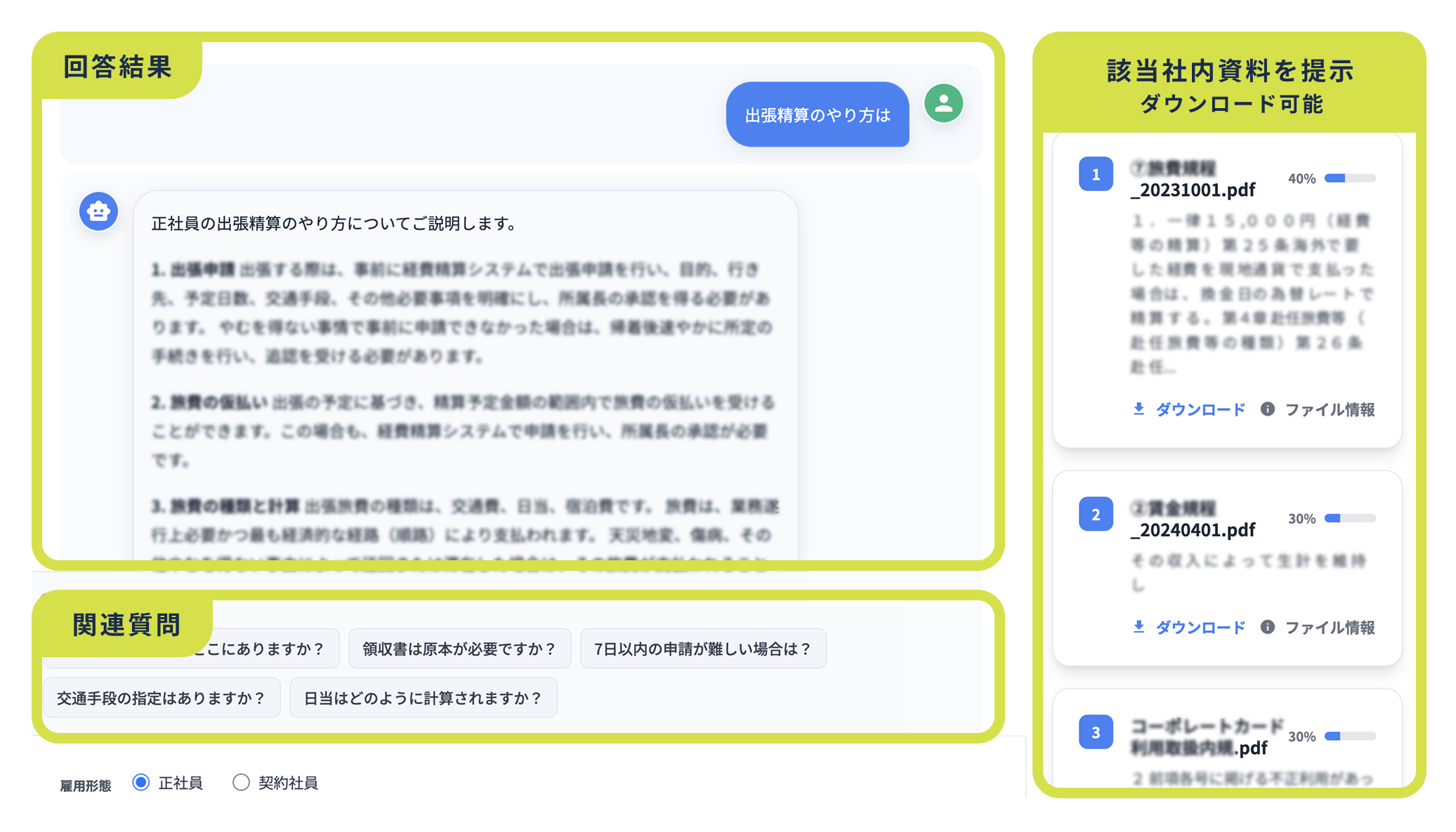 社内規定、営業資料、ツール操作マニュアル、部門別ノウハウなどをまとめてAIが整理・構造化。従業員は“聞くだけ”で必要な情報を瞬時に取得できます。