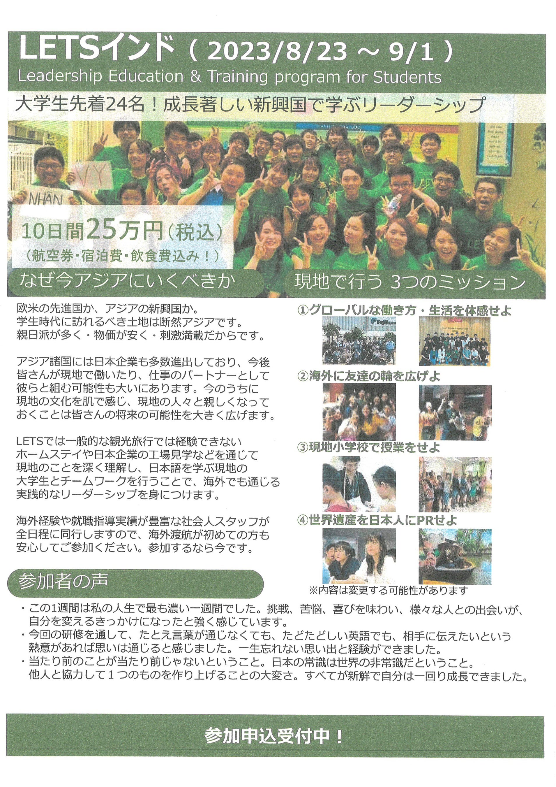 今年は夏休み期間を利用して、LETSベトナム(2023/8/9〜8/18)と、LETSインド(2023/8/23〜9/1)の2コースに大学3年生の約48名が参加予定です。なお、本学の学生に加えて、学外からも3大学の学生も合同で参加する予定です。