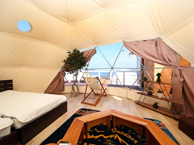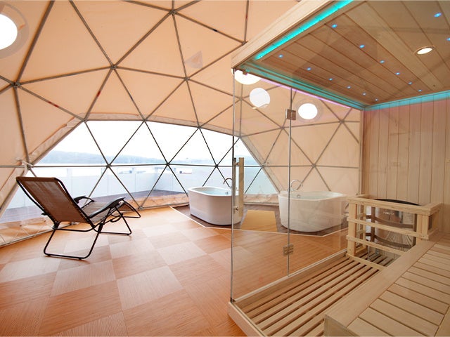 ツインドームとして、2基のドーム型テントを配置した大人数宿泊用のサイトをリニューアルし、一つのテントは寝室として、もう一つのテントはサウナ、天然温泉を備えたSPAとしてお楽しみいただけます。