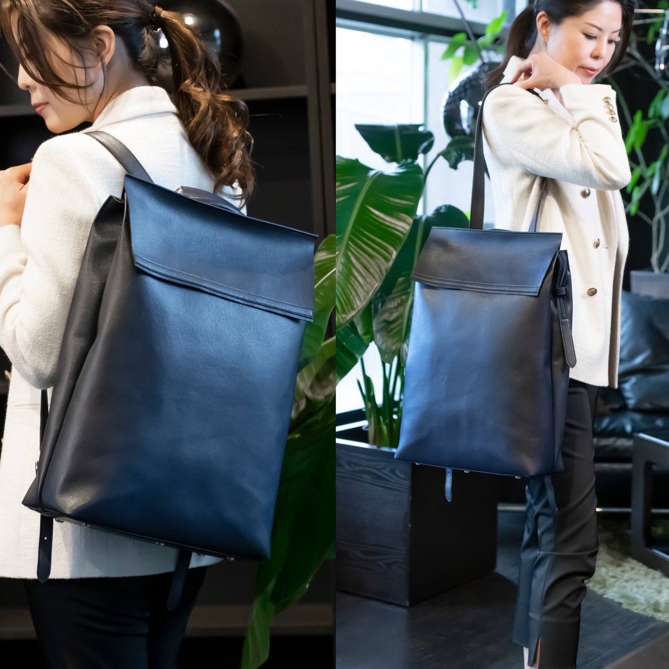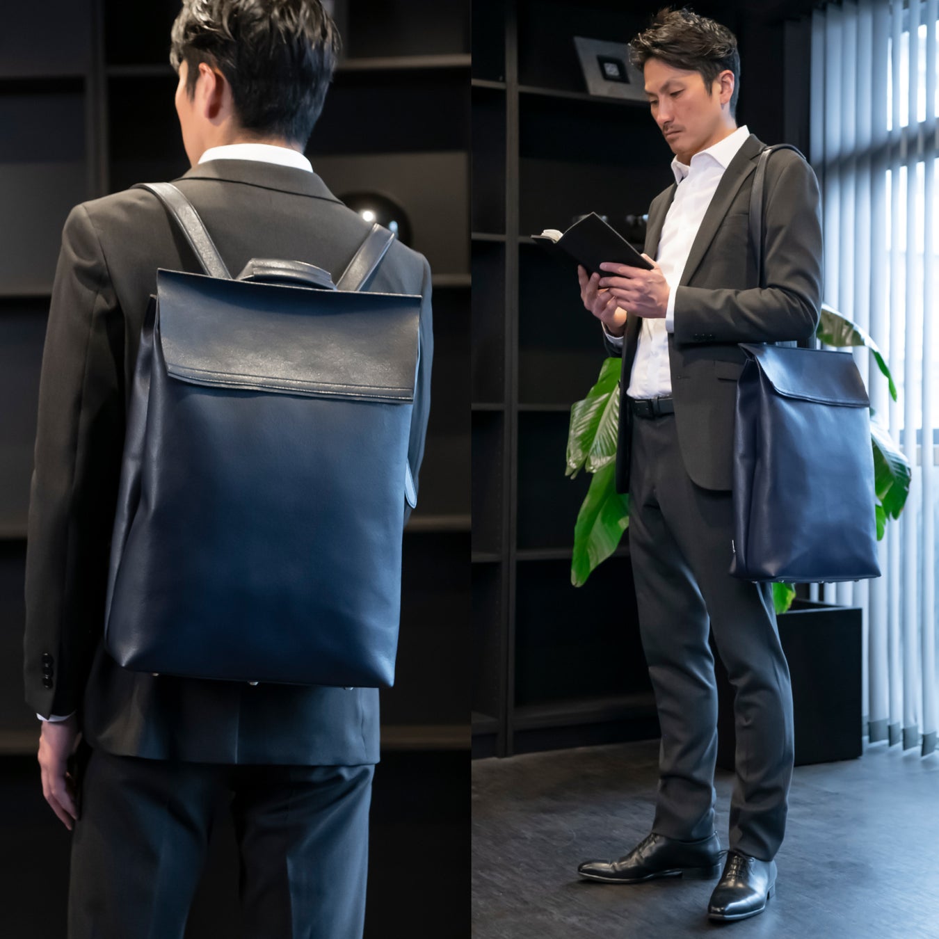 ショルダーバッグにもでき、床に自立するためビジネス利用にも最適。電車内でもスマートに周囲への配慮ができます。