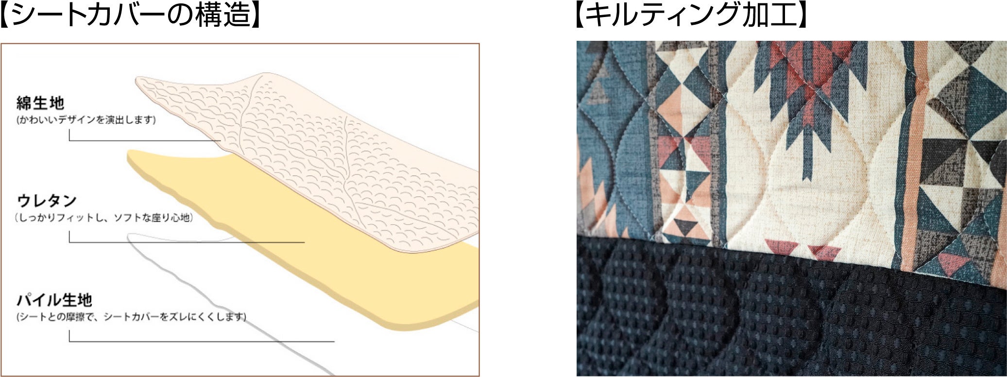 ココトリコのシートカバーは、クッション性のあるウレタンを中層に挟みこんだ3層構造を採用。フィット感とソフトな座り心地を演出します。1枚生地と比較して厚みがある分、使用時のヨレを低減し、耐久性があり、長くご利用いただけます。また、裏面にはパイル生地を採用し、摩擦が生まれることでシートとのずれを防ぎます。
