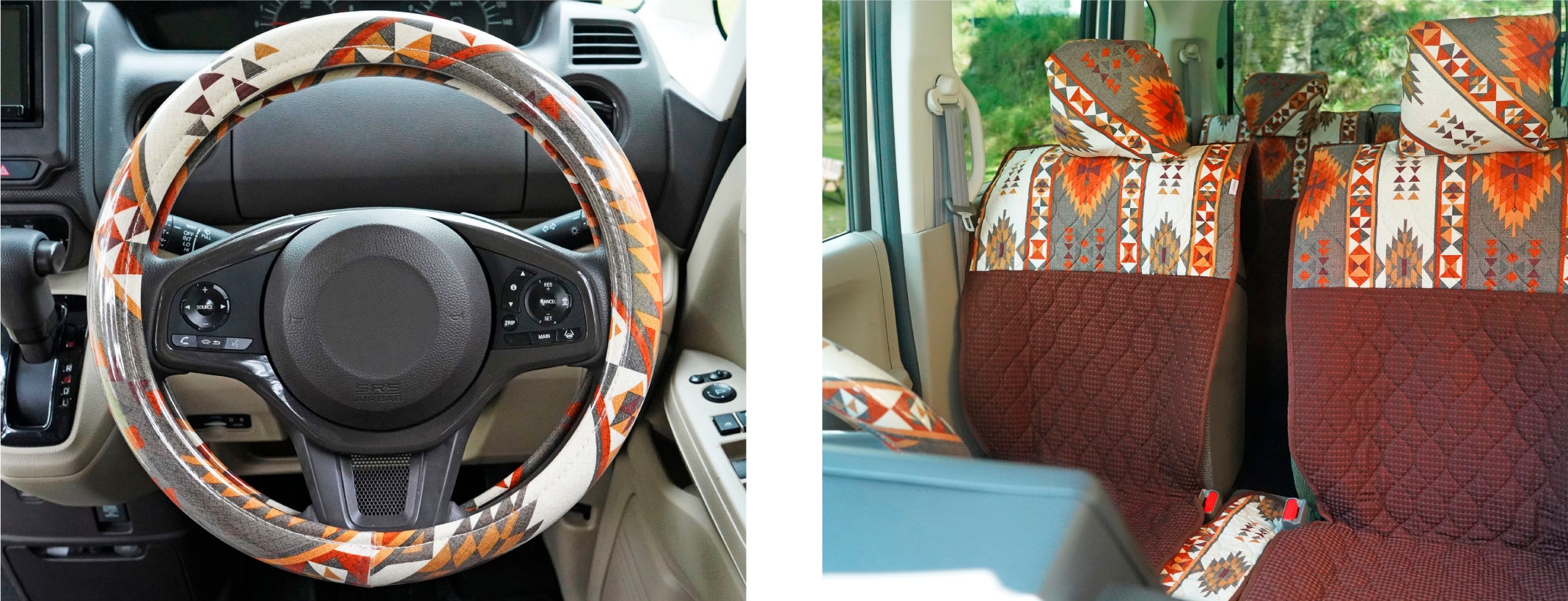 個性的なネイティブ柄でありながらも、「くすみ系カラー」の配色によりスタイリッシュな印象で、アウトドア好きの方はもちろんのこと、ご家族で使用する車にもおすすめのデザインです。
