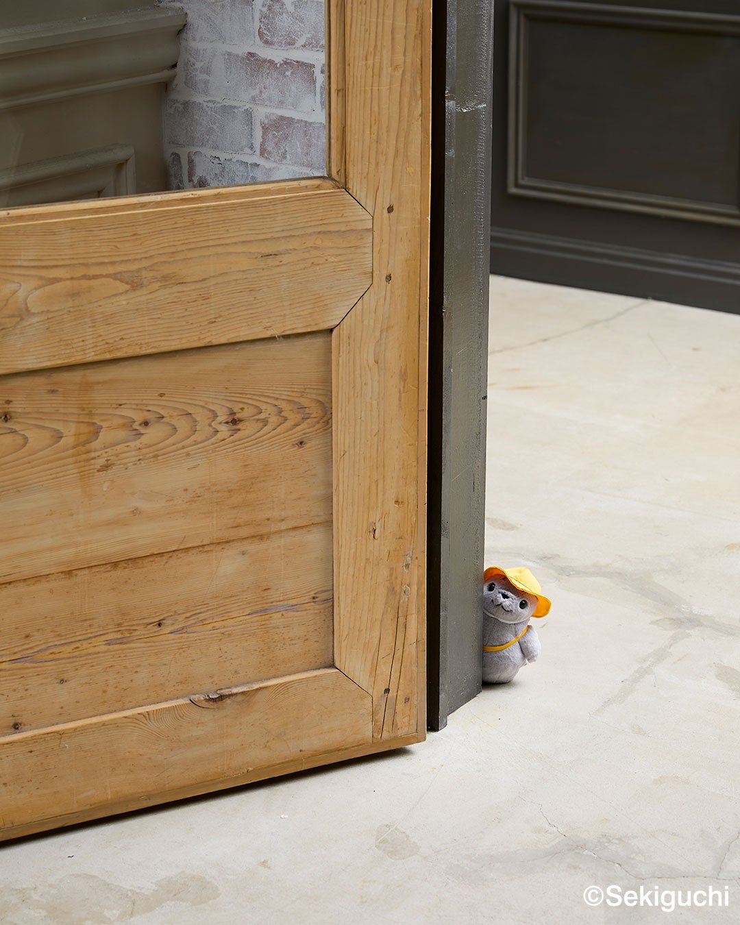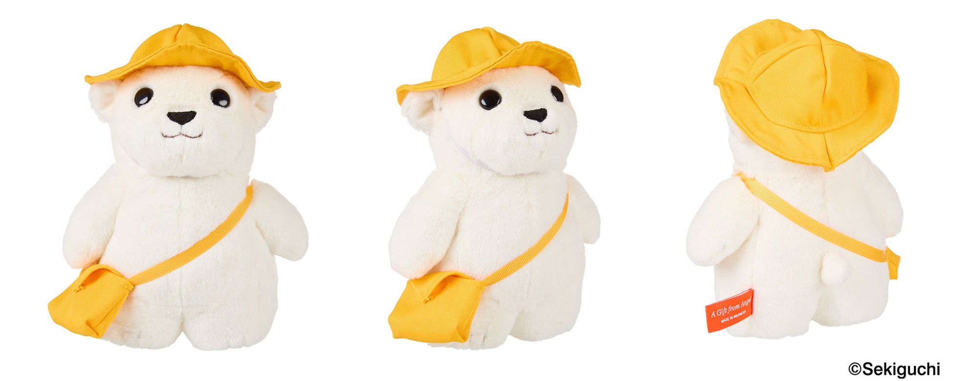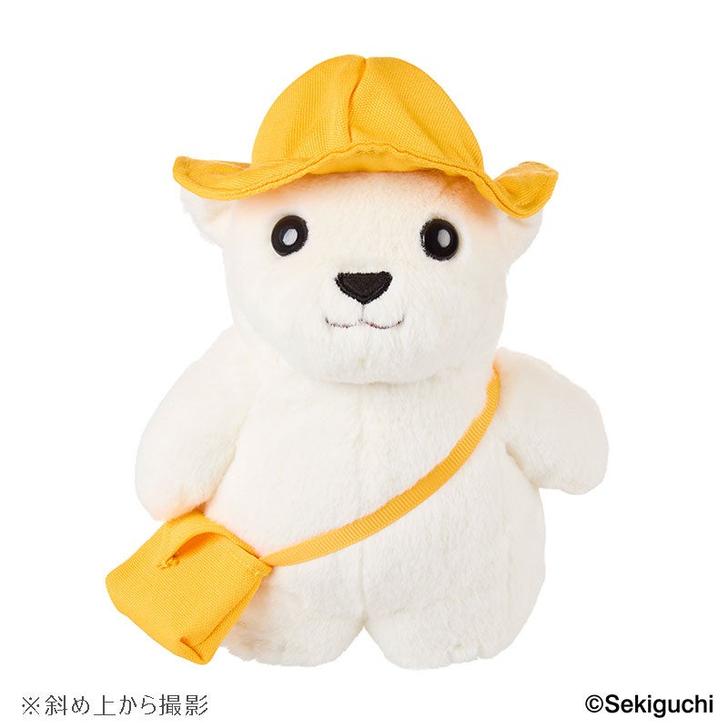 コロンとした身体に、黄色い帽子とバッグが目を引く幼稚園スタイルのアニマルぬいぐるみです。