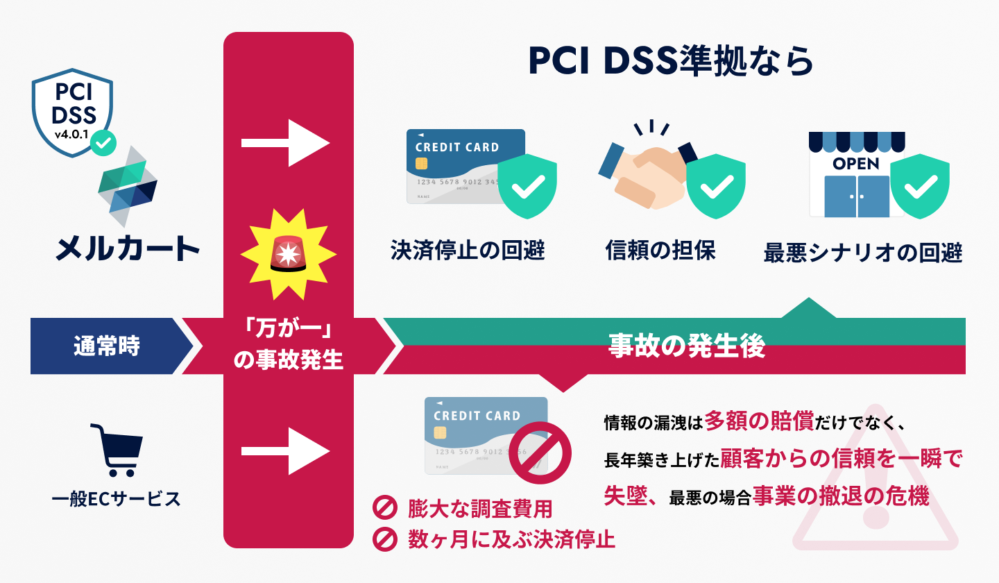ECサイトにおいて万が一、情報漏洩などのセキュリティ事故が発生した場合、カード決済の継続や再開には、PCI DSS準拠が条件となる場合があります。自社でこの事後対応を行うには、膨大な調査費用と場合によっては数ヶ月に及ぶ決済停止を伴い、事業の存続そのものを揺るがしかねません。