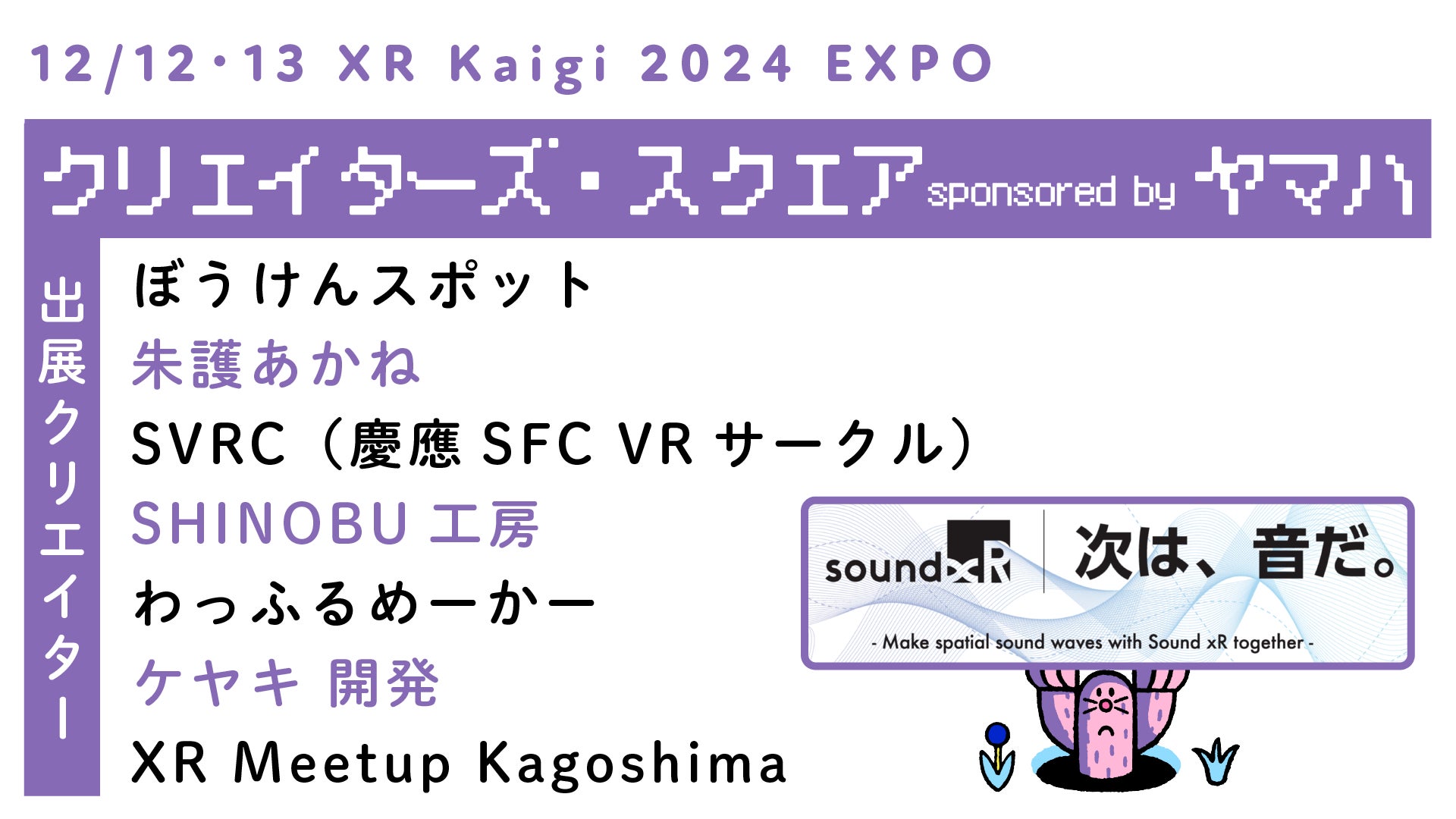 株式会社Mogura(本社:東京都千代田区、代表取締役社長:久保田 瞬)は、2024年12月11(水)〜13日(金)の3日間にわたり、バーチャル領域(XR/メタバース/VTuber)の担い手が一挙に集結するカンファレンス「XR Kaigi 2024」内で、ヤマハ株式会社が協賛する「クリエイターズ・スクエア」に出展するクリエイターを発表しました。エキスポ・ステージエリアでは、様々なテーマで開発者同士が意見交換できる「クリエイター・アンカンファレンス」や、オープニング・キーノートでも登壇するコヤ所長に企画にまつわる相談ができる「コヤ道場」、学生のための進路相談コーナー「畑田道場」などの特別企画を実施します。