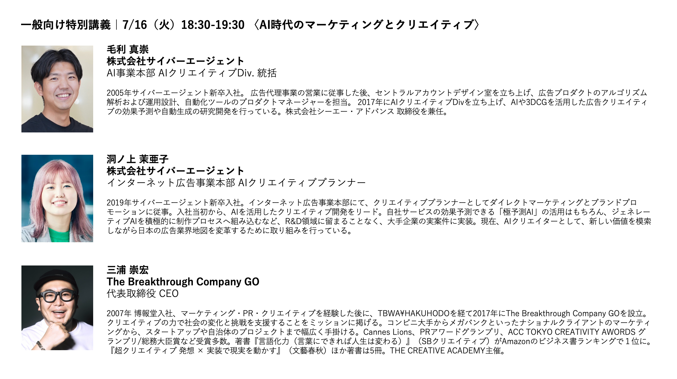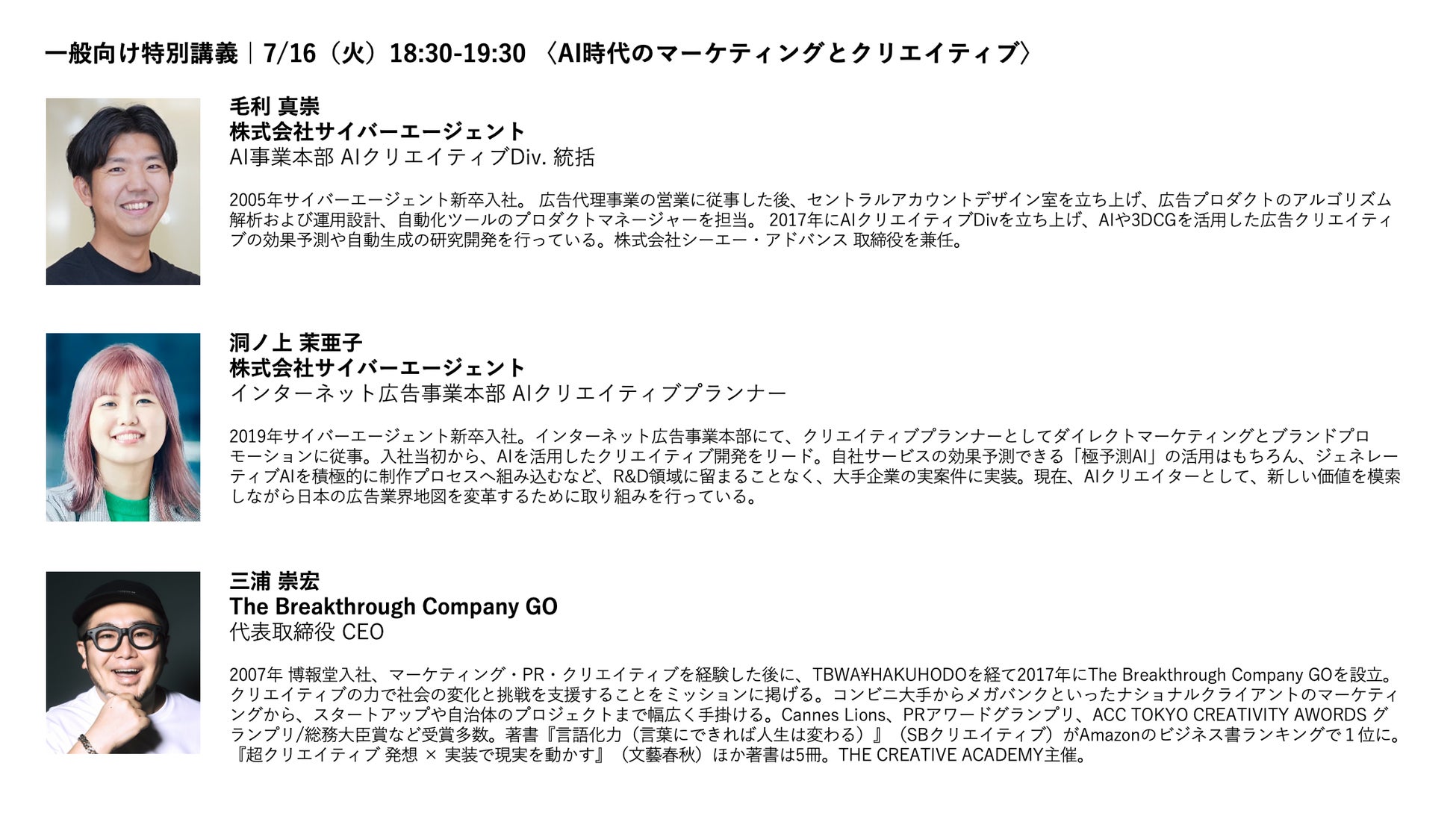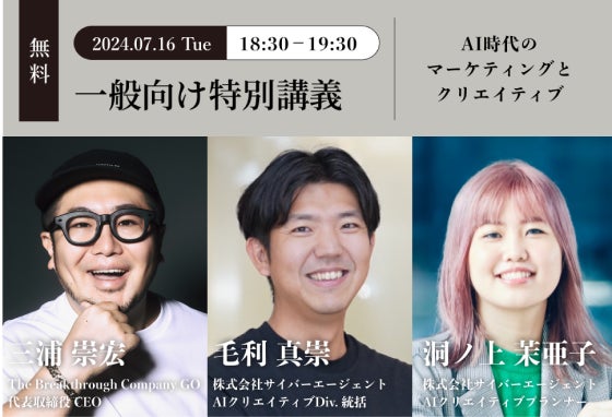 「THE CREATIVE ACADEMY AI×クリエイティブ講座」では、どなたでも無料で参加可能なオンラインの「一般向け特別講義」を、募集期間中に開催。今回の「一般向け特別講義」では、クリエイティブとAIの力でクライアントのビジネスを成長させるサイバーエージェントの毛利真崇氏・洞ノ上茉亜子氏をお招きし、本講座を受講することで得られる考え方や、手法などをお伝えします。オンライン上で開催しますので、ぜひお気軽にご参加ください。