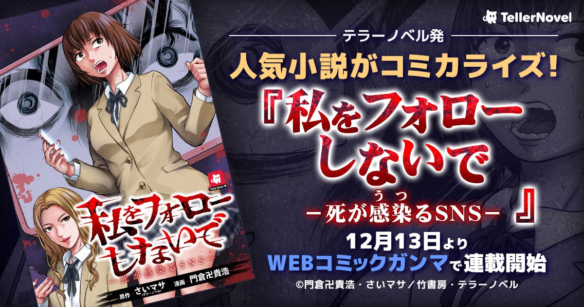 株式会社テラーノベル(本社:東京都港区、代表取締役社長:蜂谷宣人)はこの度、累計DL数760万(※)の小説共有プラットフォーム「テラーノベル( https://teller.jp/ )」発の人気小説がコミカライズされ、『私をフォローしないで −死が感染(うつ)るSNS−』として12月13日より「WEBコミックガンマ」(https://webcomicgamma.takeshobo.co.jp/ )にて連載を開始することをお知らせいたします。