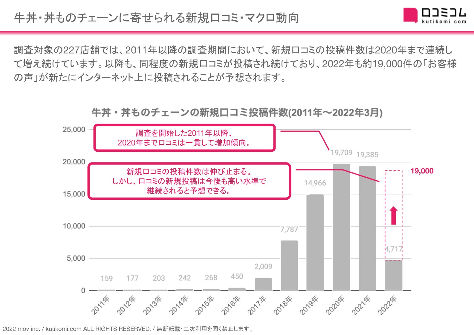 調査対象の227店舗では、2011年以降の調査期間において、新規口コミの投稿件数は2020年まで一貫して増加し続けています。今後も高い水準での投稿件数は継続されると予想されます。