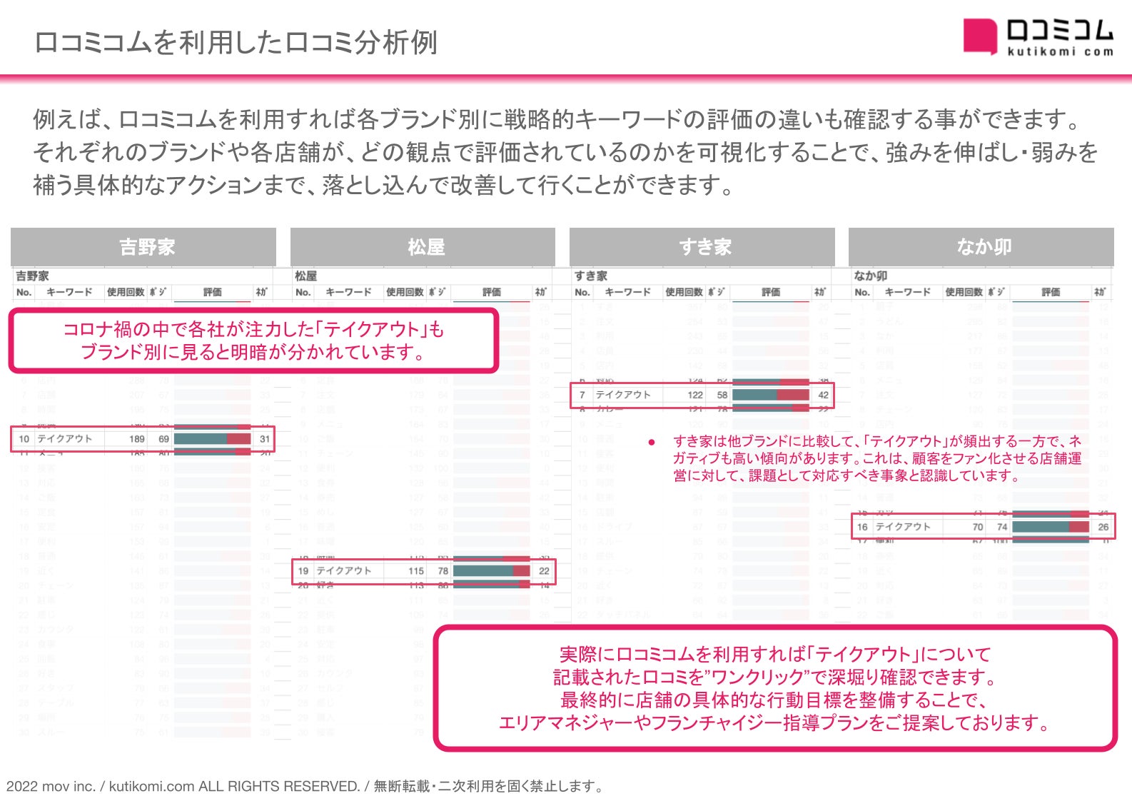 お客様の声のDXサービス「口コミコム」を運営する株式会社mov(代表取締役:渡邊 誠、本社:東京都渋谷区、以下mov)は、「口コミコム」独自の「分析機能」を用い、「牛丼・丼ものチェーン4ブランド」の口コミ分析レポートを作成しました。