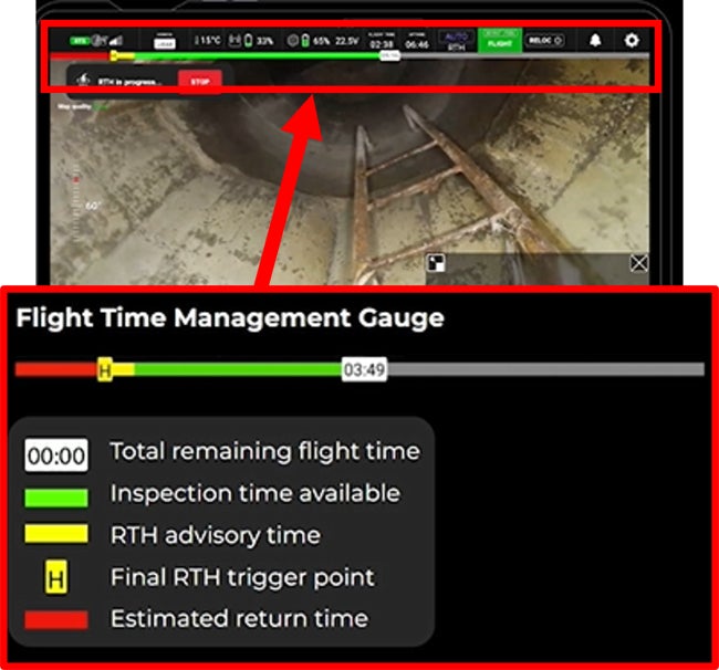 バッテリーの残量をフライト管理ゲージとして可視化し、操縦アプリ「Cockpit」内上部に表示することができます。ゲージ内には緑色は飛行時間、黄色は帰還推奨時間を表し、赤色は推定帰還時間が示されています。また、帰還が必要なタイミングで、パイロットに通知します。