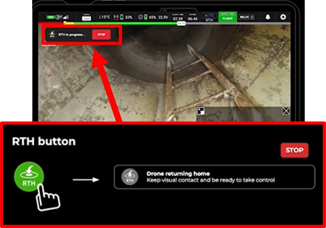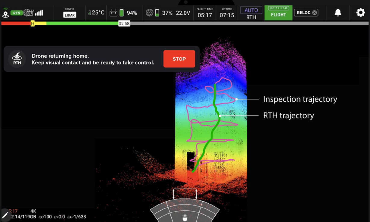 Smart RTH機能には、①離陸地点までの最短経路を自動設定、②フライト管理ゲージで帰還のタイミングを通知、③いつでも操作の切り替えが可能、といった特徴があります。これにより、ドローンパイロットは操縦時、バッテリーの残量や帰還のための経路を心配することなく、目の前の点検作業に集中することができます。