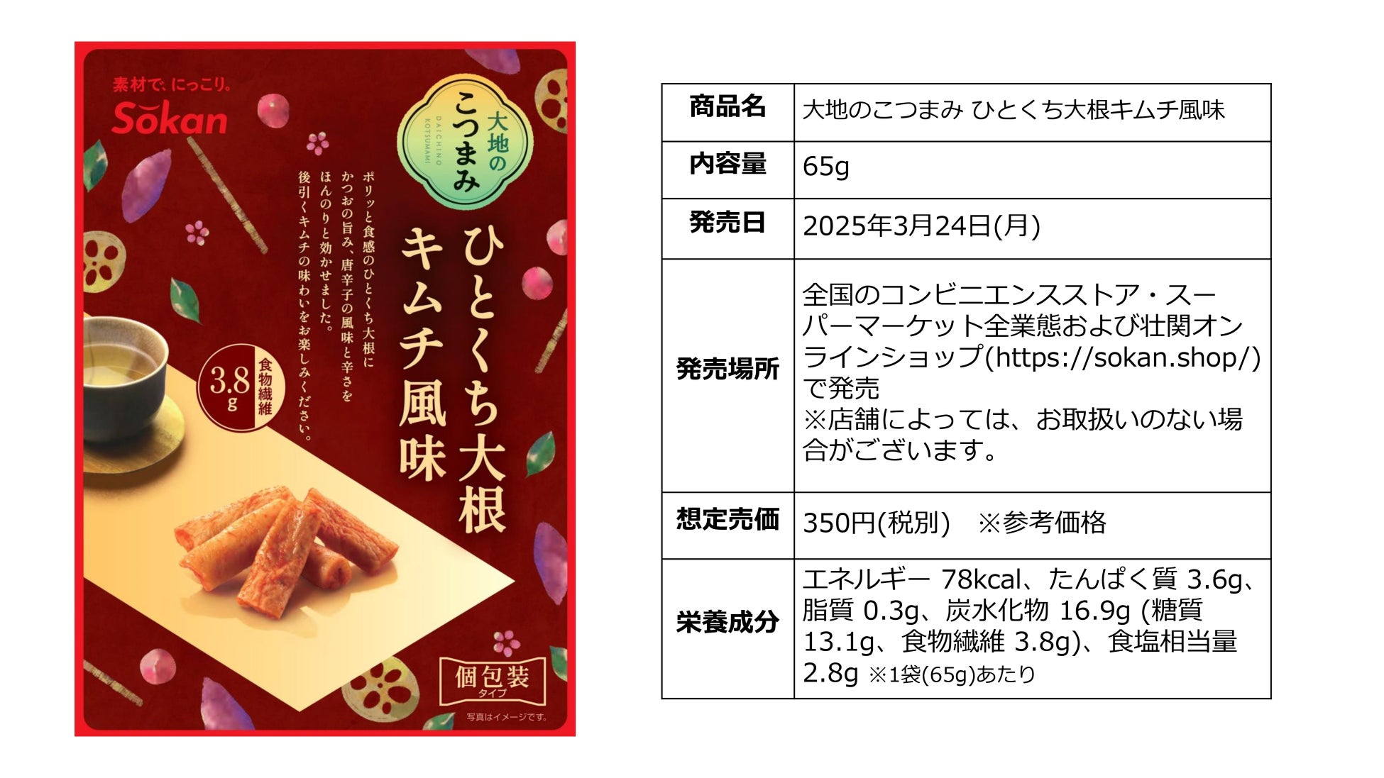 株式会社壮関(本社:栃木県矢板市 代表取締役社長:板山 健一)は、“おつまみでもなく、おやつでもない、食べたいときに違和感なく、ちょっとつまんで食べやすい、適度な量で食べられる素材とカタチ“をコンセプトにした「海と大地のこつまみシリーズ」より、『大地のこつまみ ひとくち大根キムチ風味』を全国のコンビニエンスストア・スーパーマーケット全業態および壮関オンラインショップ(https://sokan.shop/)で発売いたします。