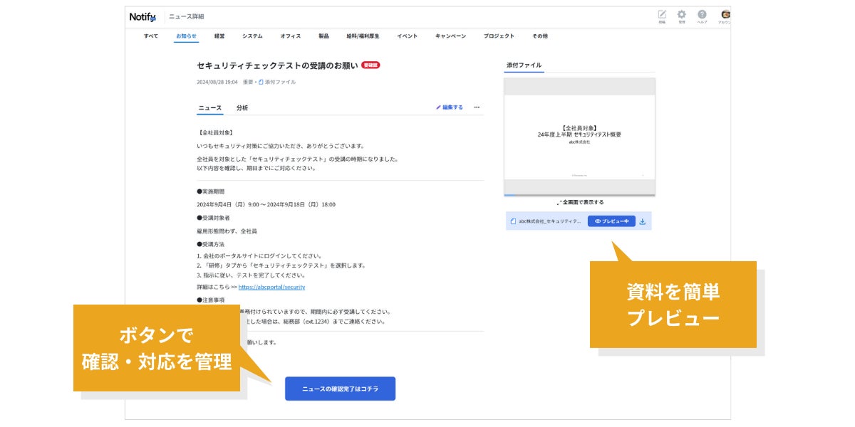 情報を確実に届けることを目的とし、さまざまな機能を展開しているため、発信した内容が確実に社員へ届く仕組みです。また、情報の「閲覧」だけで終わらないよう、その先の「対応」の実施までリマインドします。