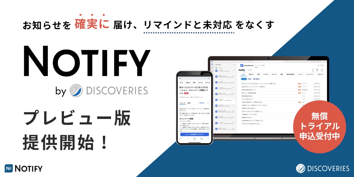 ディスカバリーズ株式会社は、社内にお知らせを確実に届け、リマインドと未対応をなくすアプリ、「Notify」のプレビュー版を公開して、無償でトライアル提供することを発表しました。