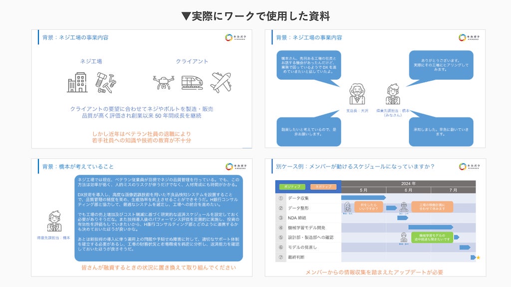 ワークのテーマは「お客さまの設備資金ニーズに対して融資実行をする」に設定。融資のためにDX支援が必要なケースを題材として定め、プロジェクトの中で発生するタスクを洗い出し、スケジュールマネジメントを学びました。