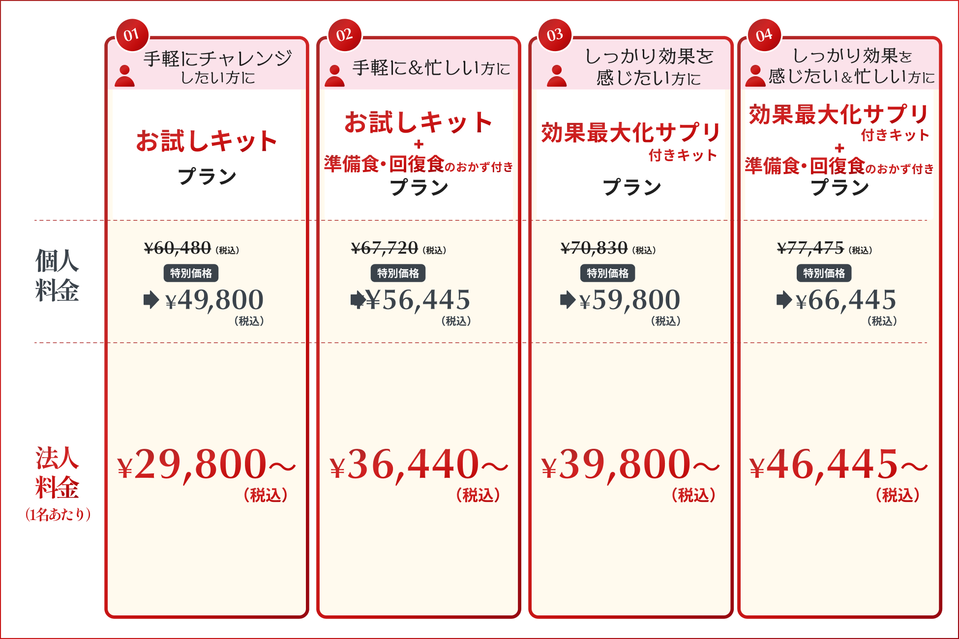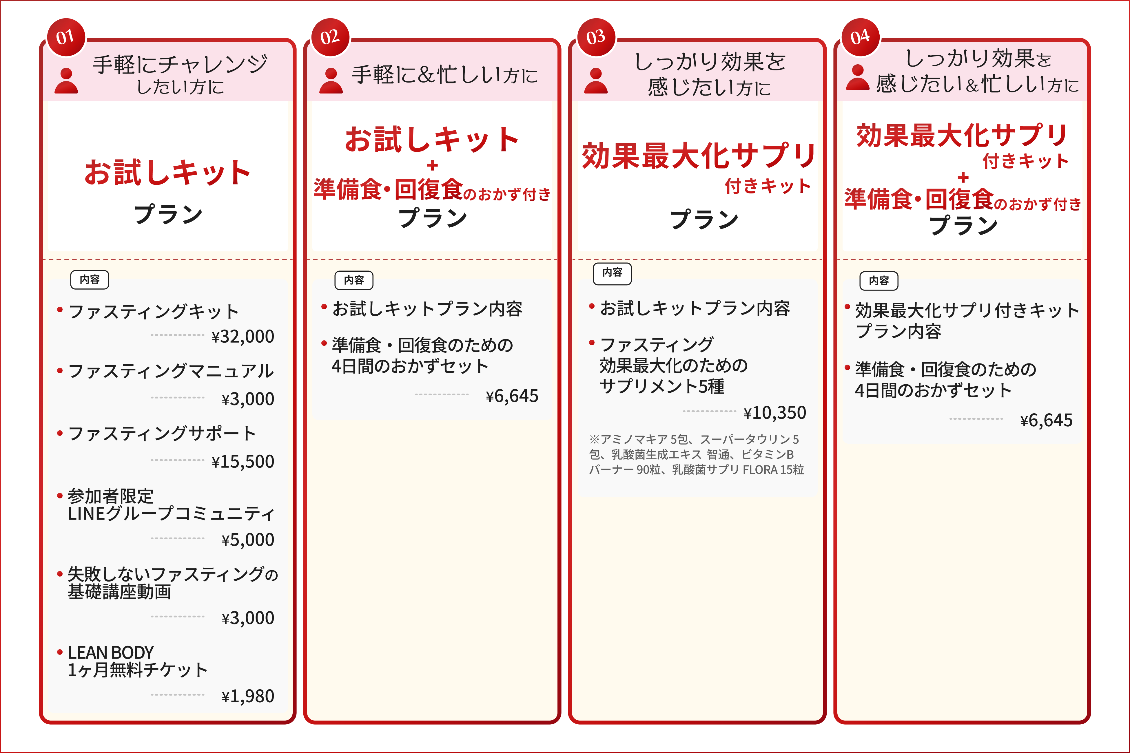 手軽に本格ファスティングを体験いただける「お試しキットプラン」と、ファスティングの効果を最大化できる「効果最大化サプリ付きキットプラン」をご用意。
