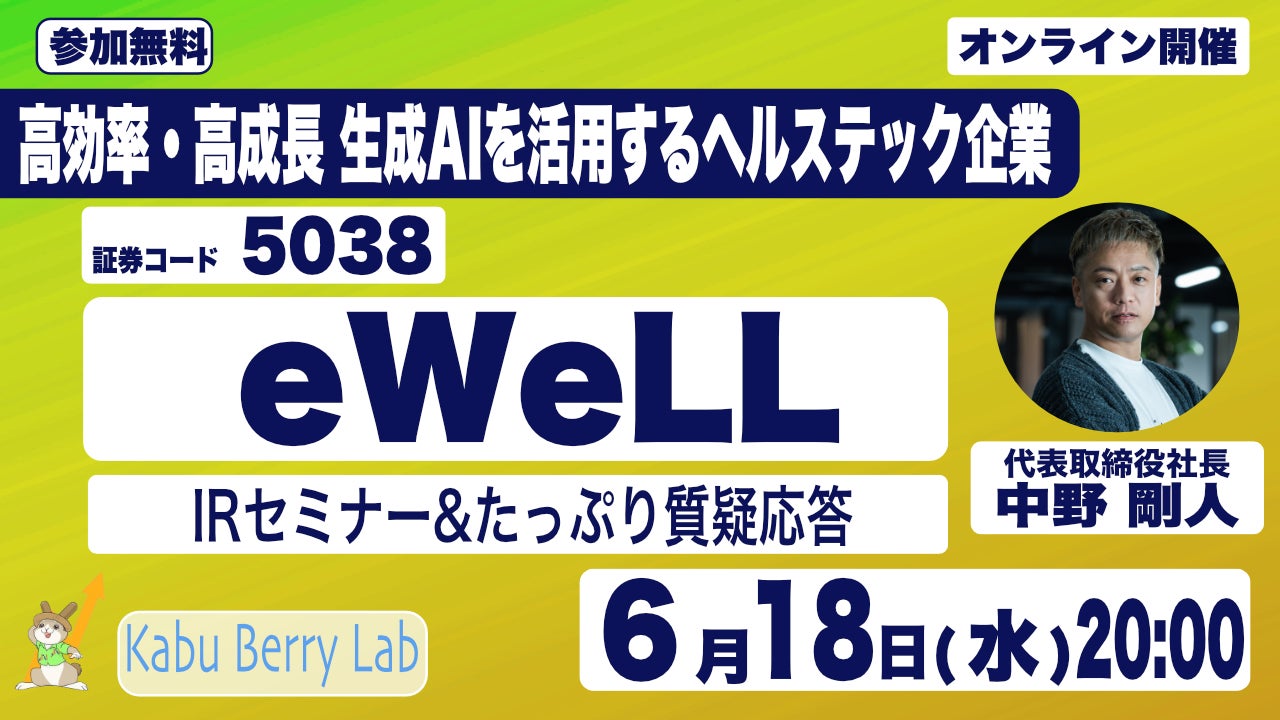 株式会社eWeLL(証券コード:5038 本社:大阪市中央区 代表取締役社長:中野剛人)は、2025年6月18日(水)20時より開催される個人投資家向け「Kabu Berry Lab IRセミナー」に初登壇いたします。