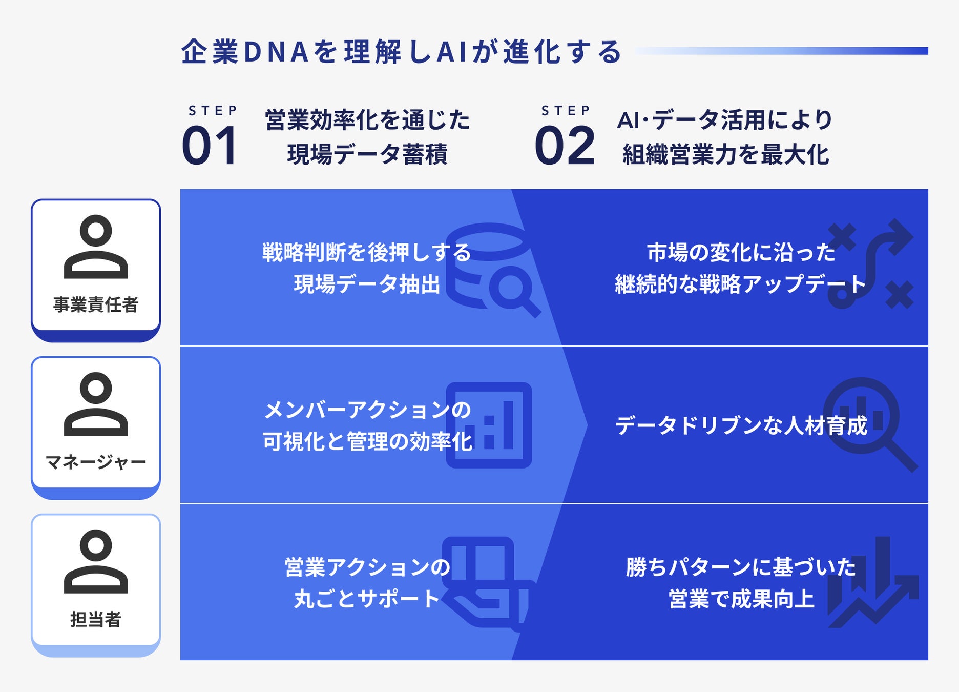 人材育成の観点でも、過去の営業実績データをもとにメンバーの行動傾向を分析し、一人ひとりに合わせたマネジメントや育成施策を検討することが可能になります。さらに、事業責任者はAIに蓄積された現場データを活用することで、市場の変化をいち早くキャッチし、継続的に戦略へ反映させることができます。
