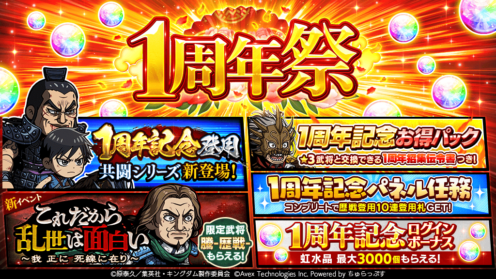 株式会社ディー・エル・イー(本社:東京都千代田区、代表取締役社長:小濵直人、以下DLE)の100%子会社であるちゅらっぷす株式会社(沖縄県那覇市、代表取締役社長:中山法夫、以下ちゅらっぷす)とエイベックス・テクノロジーズ株式会社(東京都港区、代表取締役社長:岩永朝陽)は、『キングダムDASH!!』サービス開始1周年を記念した1周年祭の開催とVer.3.0.0へのアップデートを実施いたします。