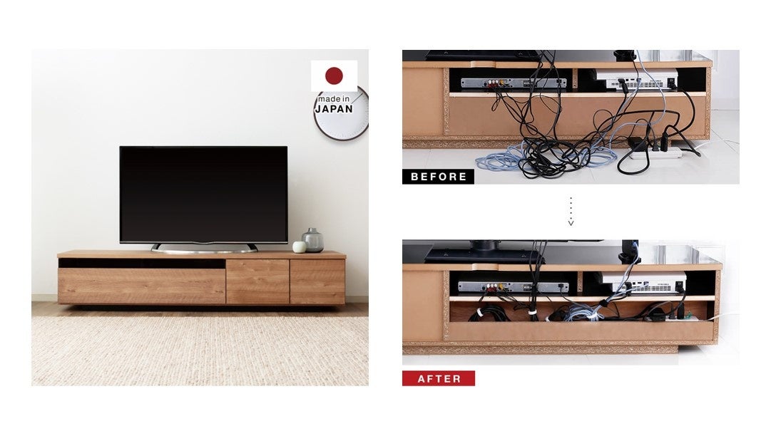 安価な輸入品とは違い、洗練された上品な見た目が光るこのアイテムは、シンプルなデザインの中に沢山の工夫がちりばめられています。正面からの外観は、取っ手の無い隠し引き戸と、扉を閉めたままでリモコン操作可能なガラス部分が美しく演出します。AV機器にとって重要な熱の逃がし方まで計算されているAV機器スペースや、散らかりがちなコード配線まで考えられた背面収納など、まさに至れり尽くせりなテレビ台です。