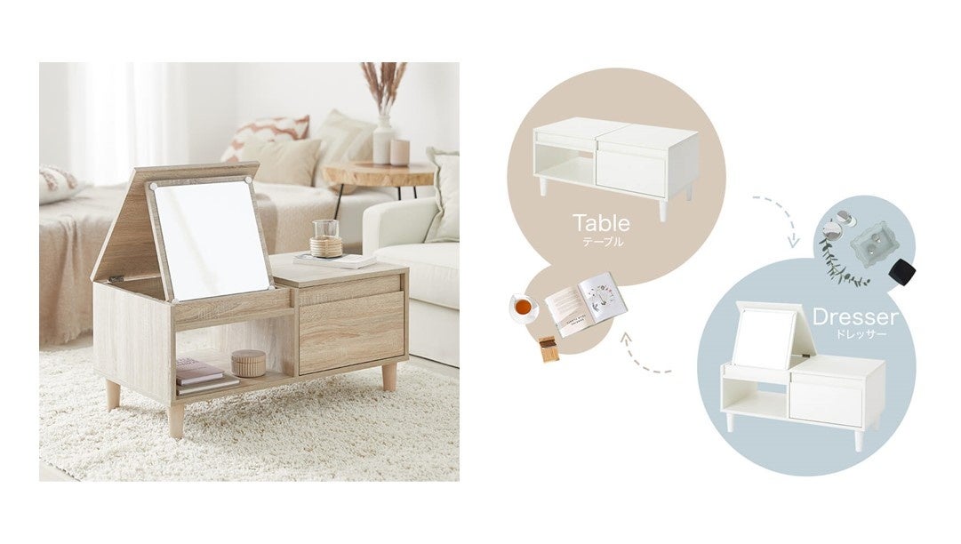 一見、普通のテーブルに見えるこちらのアイテムは、天板を開くと鏡が現れ、ドレッサーとして使用できる、まさに1台2役のテーブルドレッサーです。コンパクトなお部屋にもピッタリのアイテムで、天板下から現れる30cm四方の可動式鏡は3段階の角度調節もできるため、ポイントメイクにもバッチリ対応できます。ソファーとの相性まで考えられた高さは、一人暮らしのお部屋を広々と演出してくれるので、ものが多くなりがちなオシャレさんの味方です。