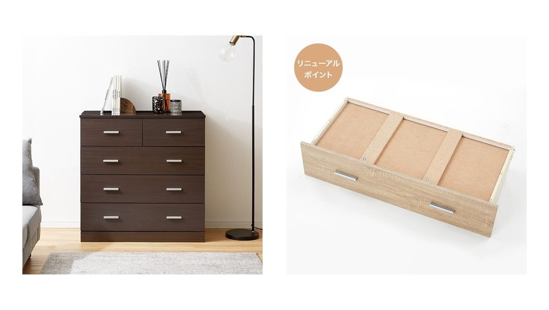 シンプルなデザインだからこそ、お部屋をすっきり見せてくれるうえに、天板はディスプレイとしても活躍します。見た目が美しいだけではなく、全面化粧仕上げなので衣服の引っ掛かりを防ぐことができるのも嬉しいPOINT。お客様からのお声を受けリニューアルされた引き出し裏の補強版など、外側だけではない工夫も光ります。