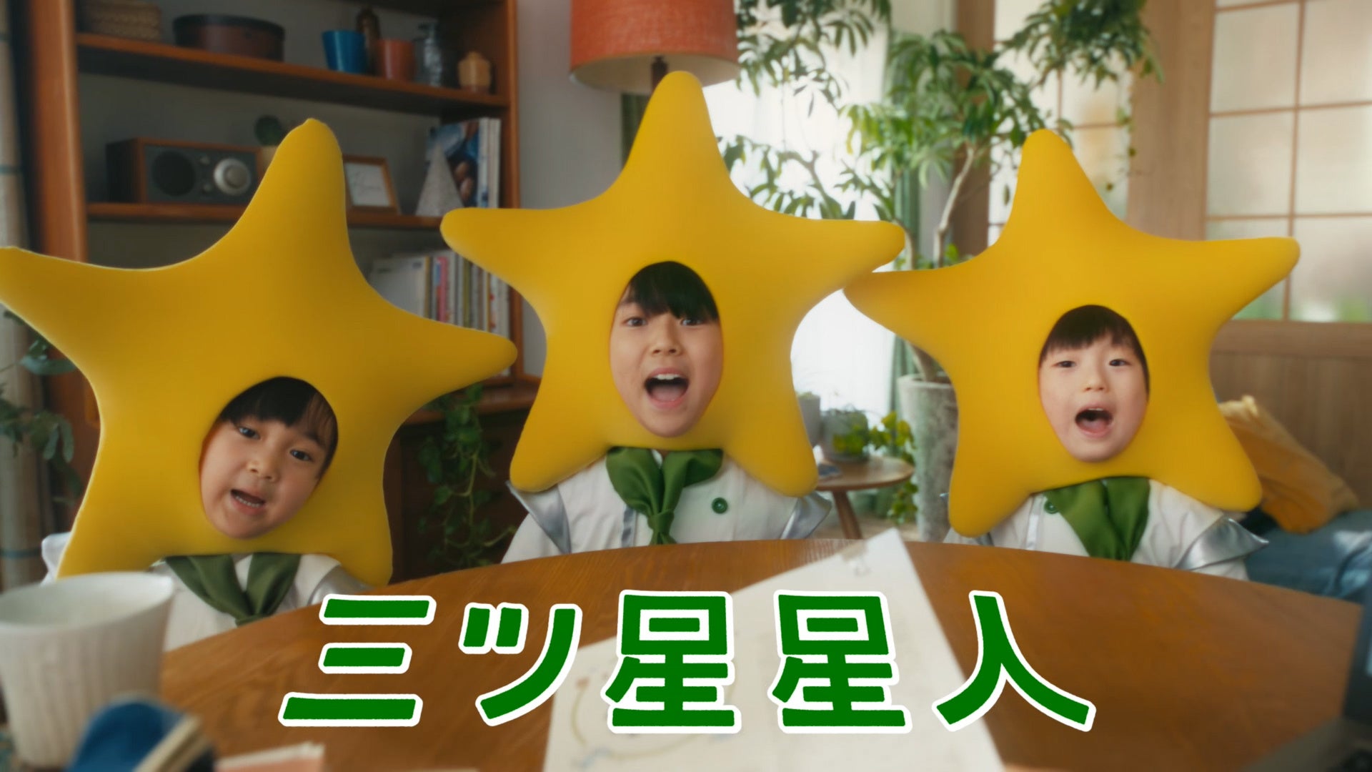 自宅で忙しく仕事をしている飯豊さん。そのような中、資料の後ろからひょっこり現れた3人の「三ツ星星人」たち。
