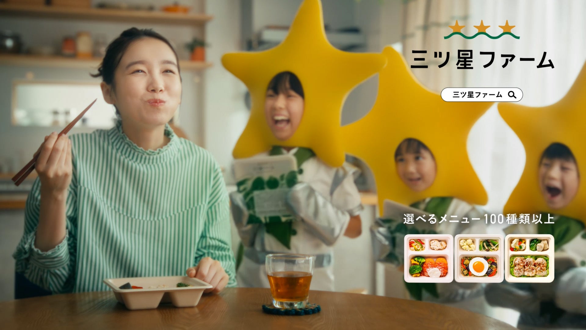 この度のTVCM第2弾では、ブランドキャラクターの飯豊まりえさんの表情や三ツ星星人のコミカルさに加えて、三ツ星ファームのバリエーション豊富な食事の数々を、目で楽しめる内容となっています。