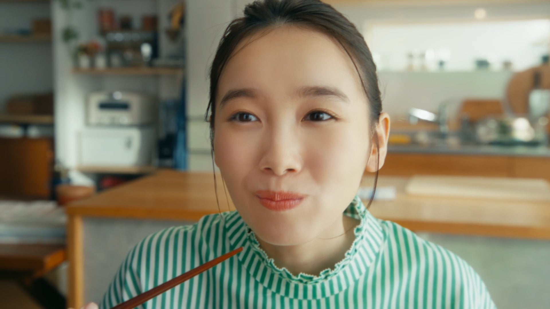「オイシイ食事ノ、誘惑ワク~!」の掛け声を聞いた瞬間、タルタルソースや肉じゃが、ハンバーグなどのおいしそうな食事の数々が脳内に広がります。レンジから取り出したサーモンフライを食べると「幸せ~」と笑みがこぼれる飯豊さん。飯豊さんの幸せそうな表情と三ツ星星人の愛嬌たっぷりな動きにも注目です。