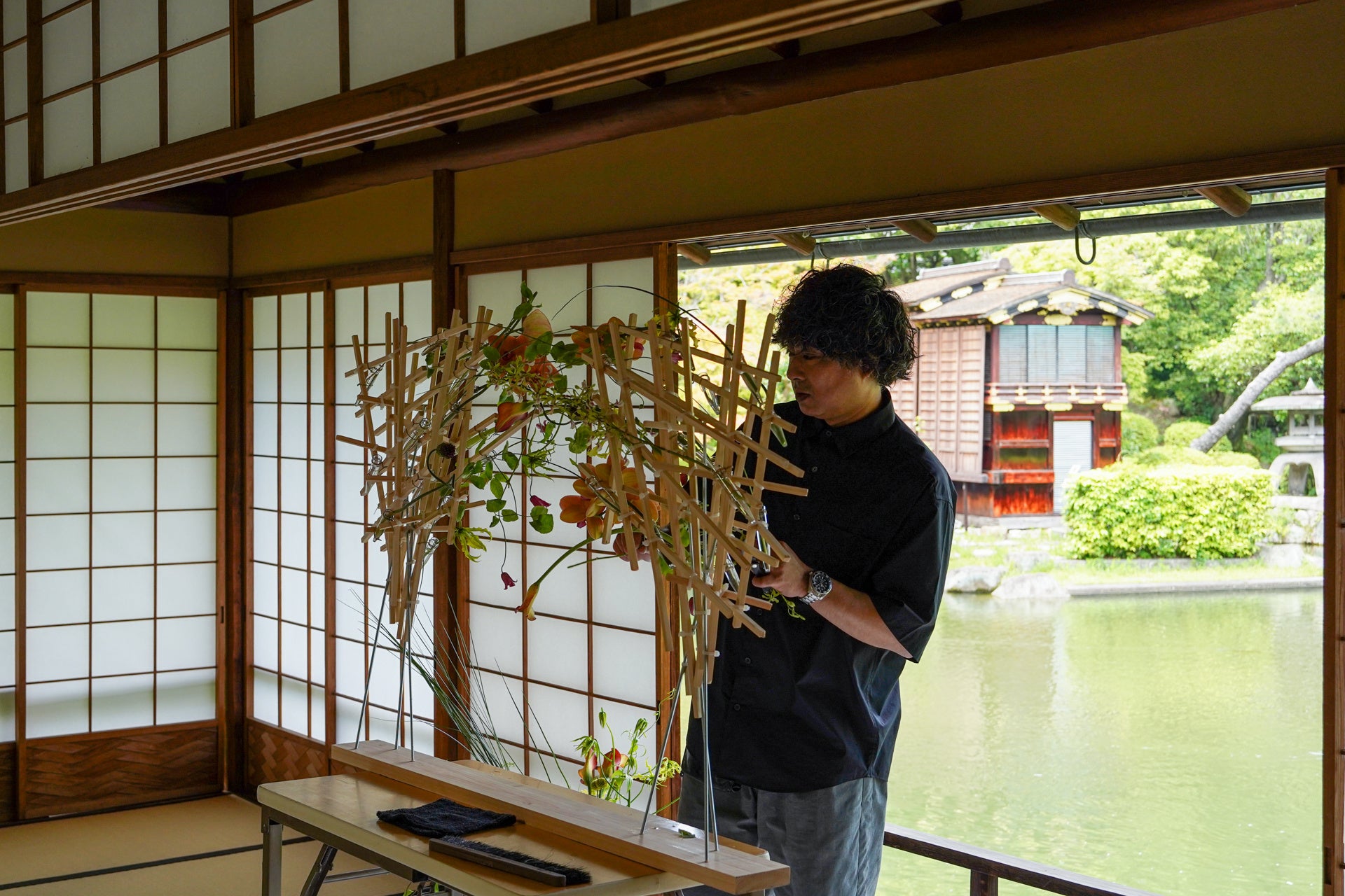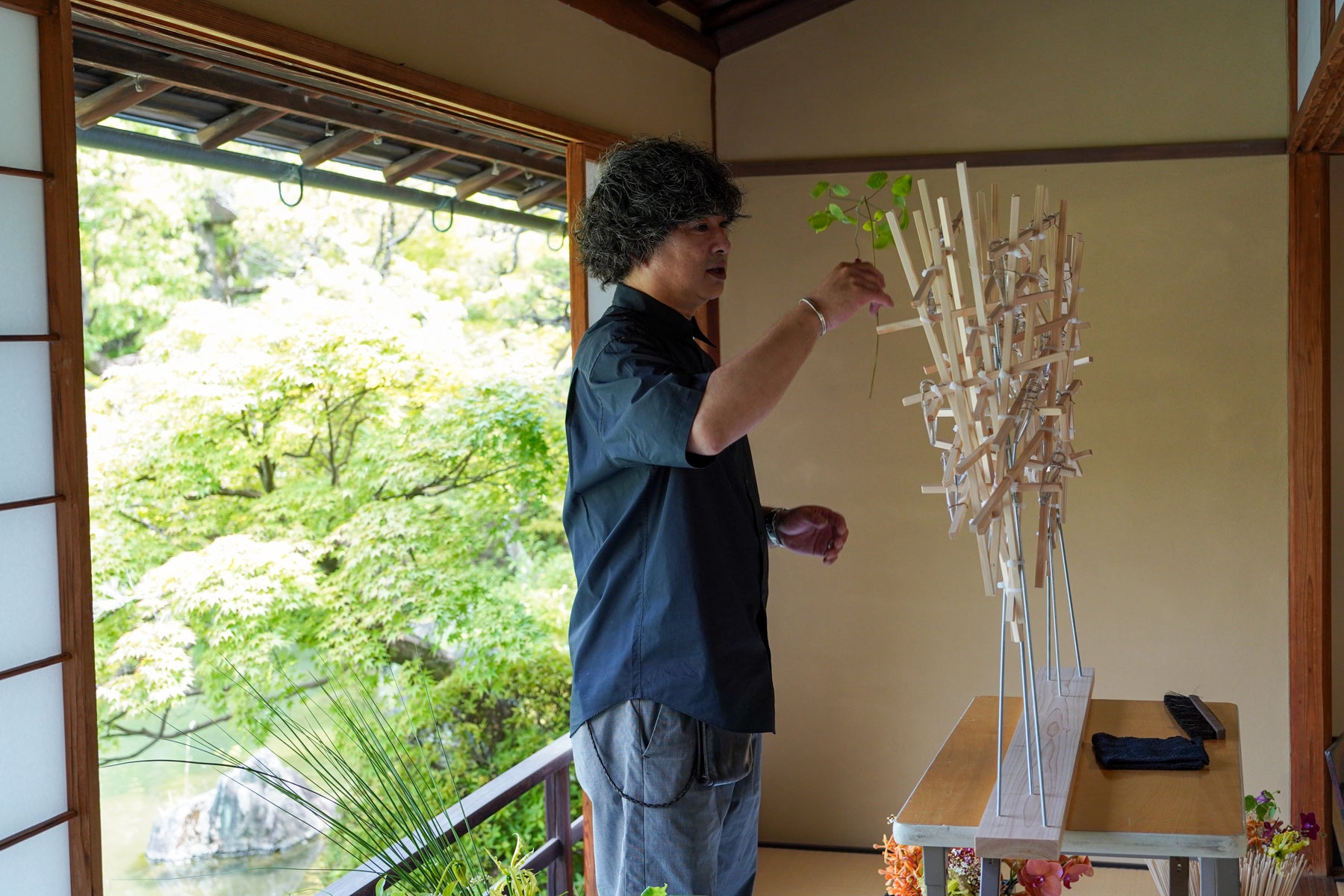 初日には、オープニングレセプションとして相楽園 浣心亭(茶室)において、「借景」をテーマにしたフラワーデザインのデモンストレーションを実施しました。