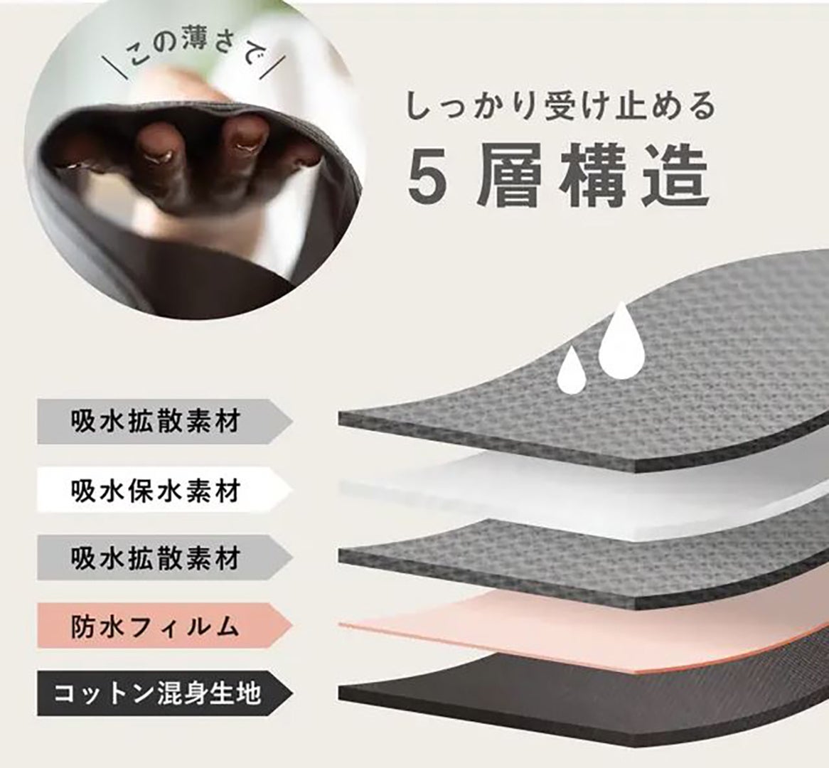 しっかり受け止める5層構造で、20~30mlの水分を素早く吸収。